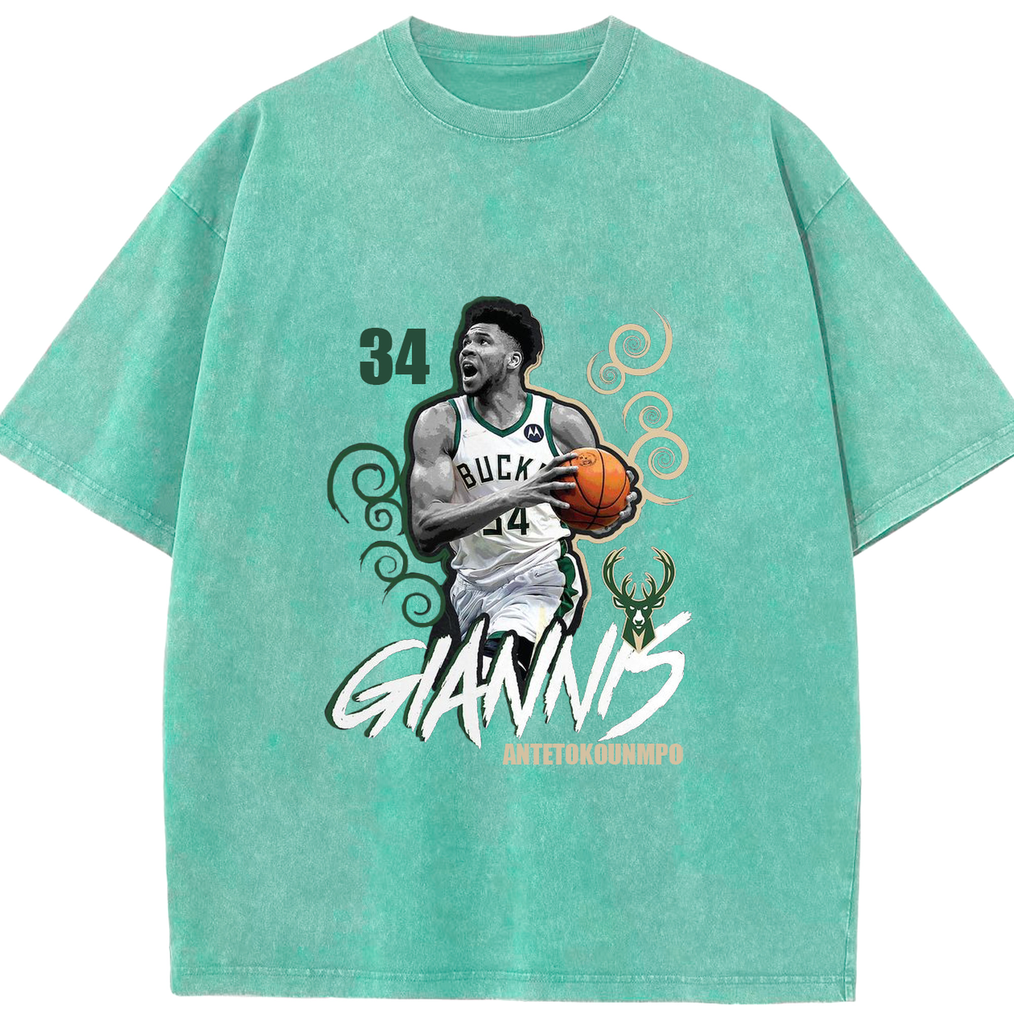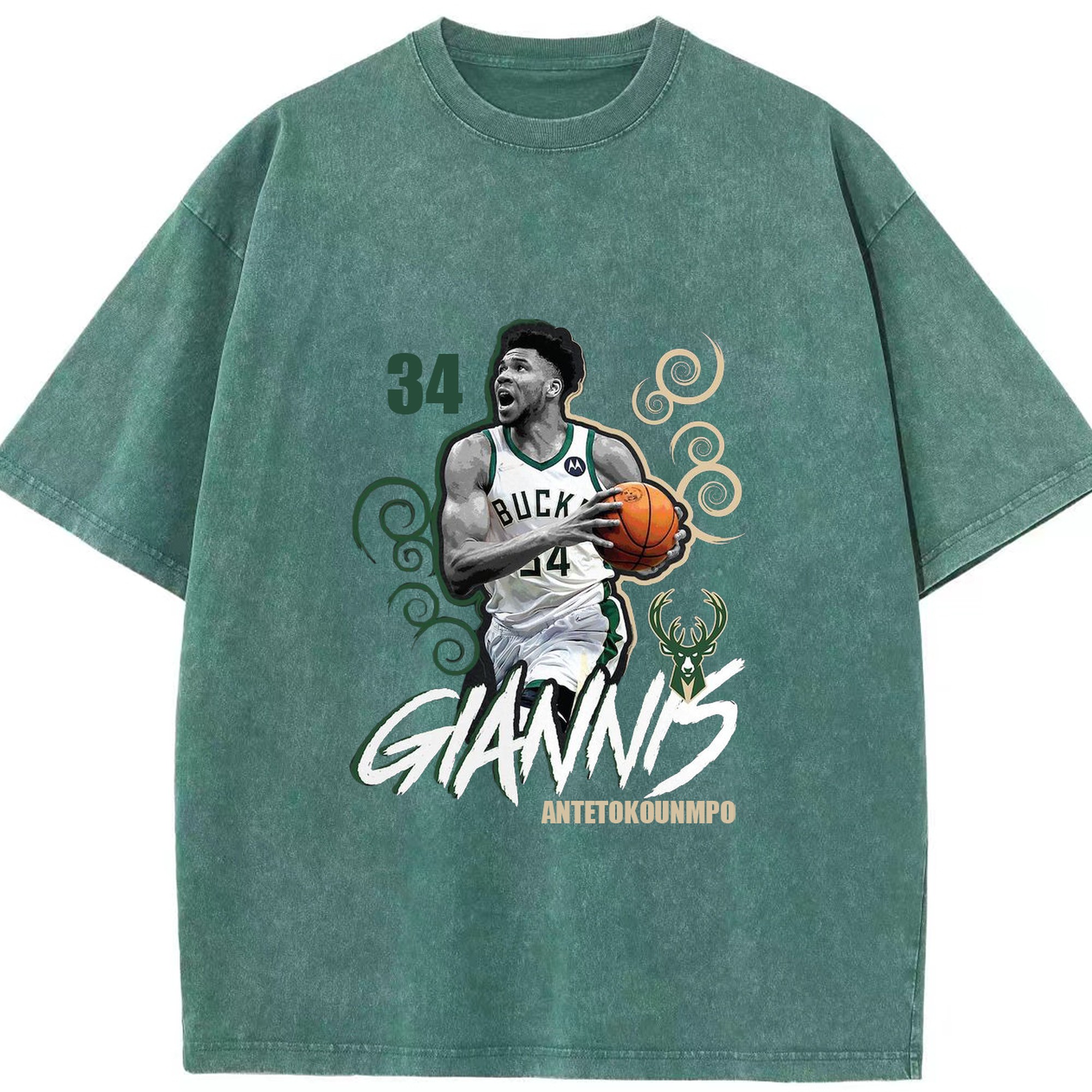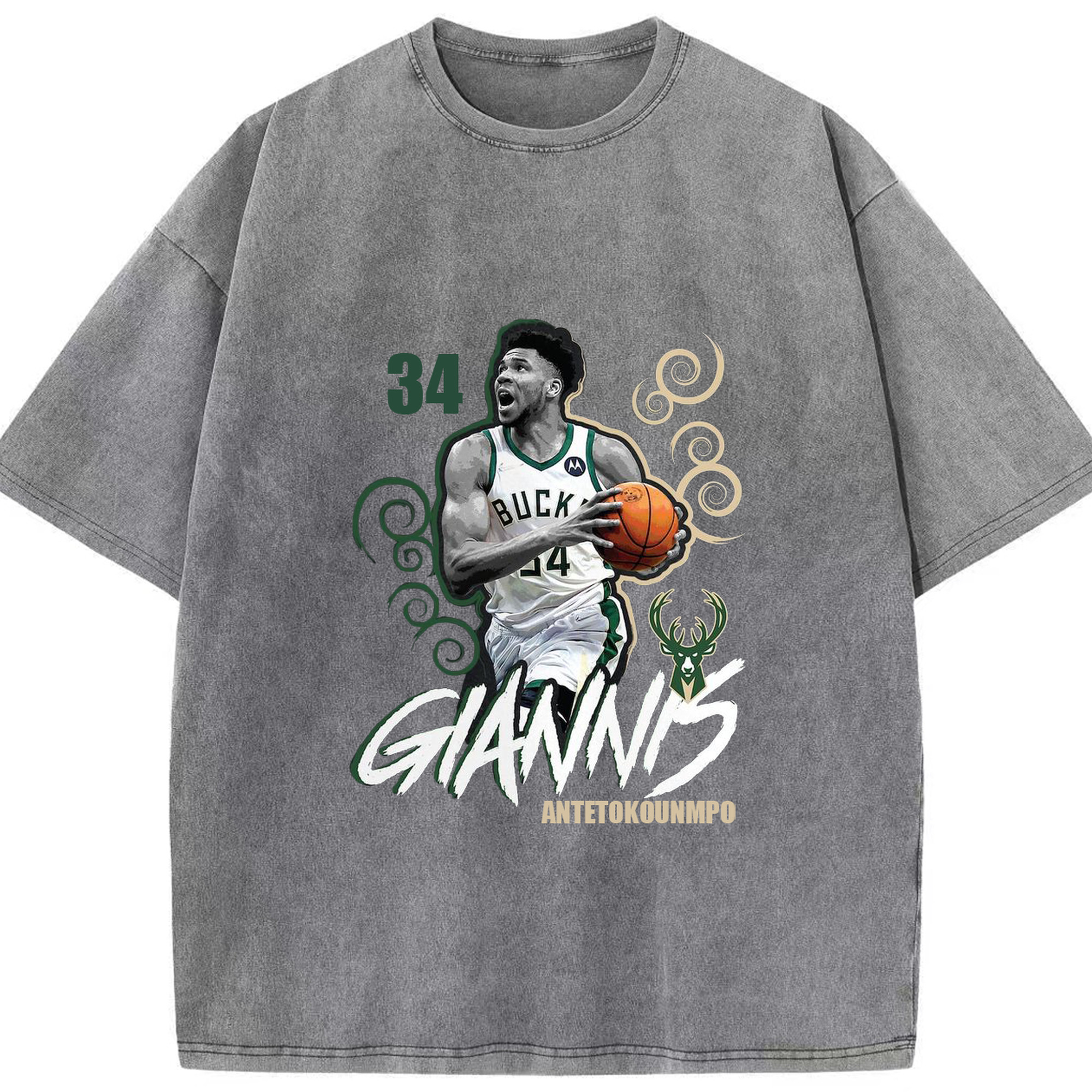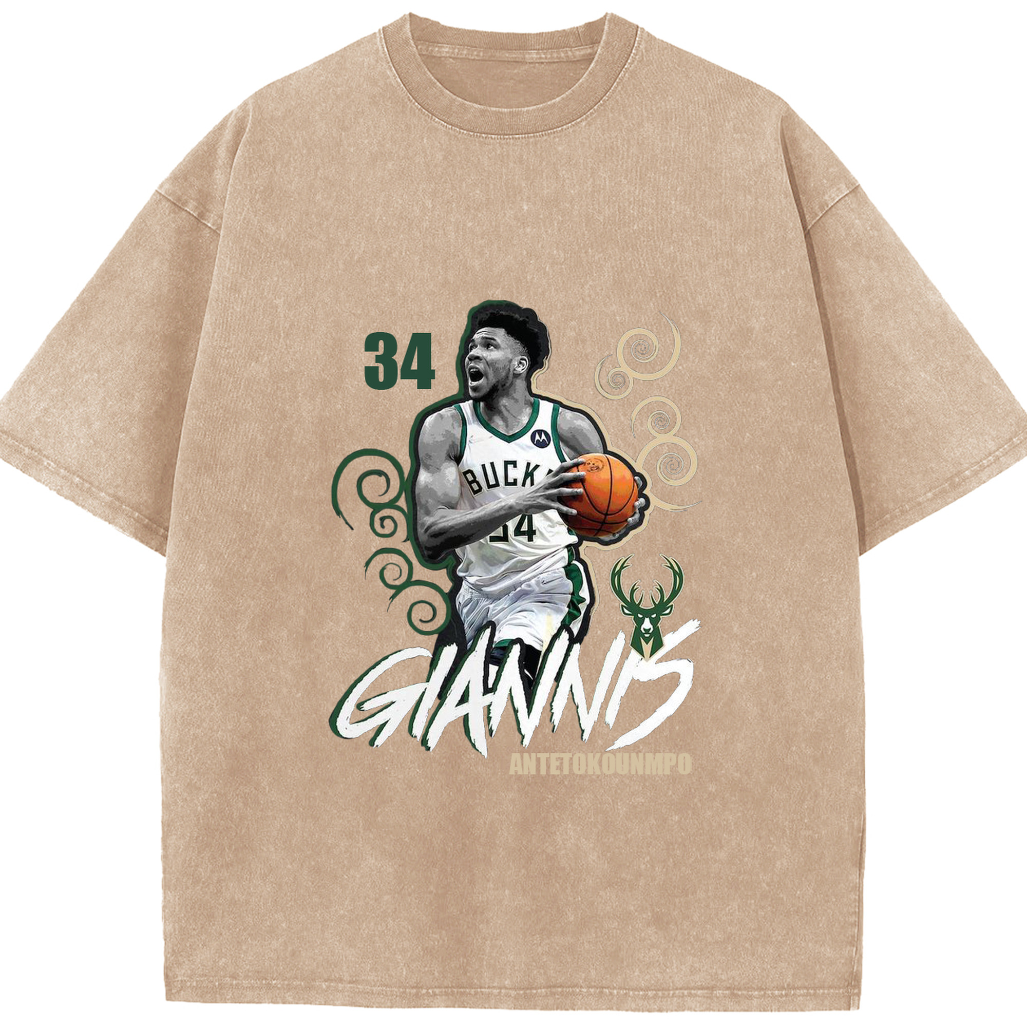 Giannis Antetokounmpo Bucks #34 artistic design Shirt - Customizable NBA Oversized T-Shirt – 230g Combed Cotton, Soft & Vintage Wash – Heat Transfer Print for Basketball Fans – Stylish Casual Wear for Game Day & Everyday Comfort