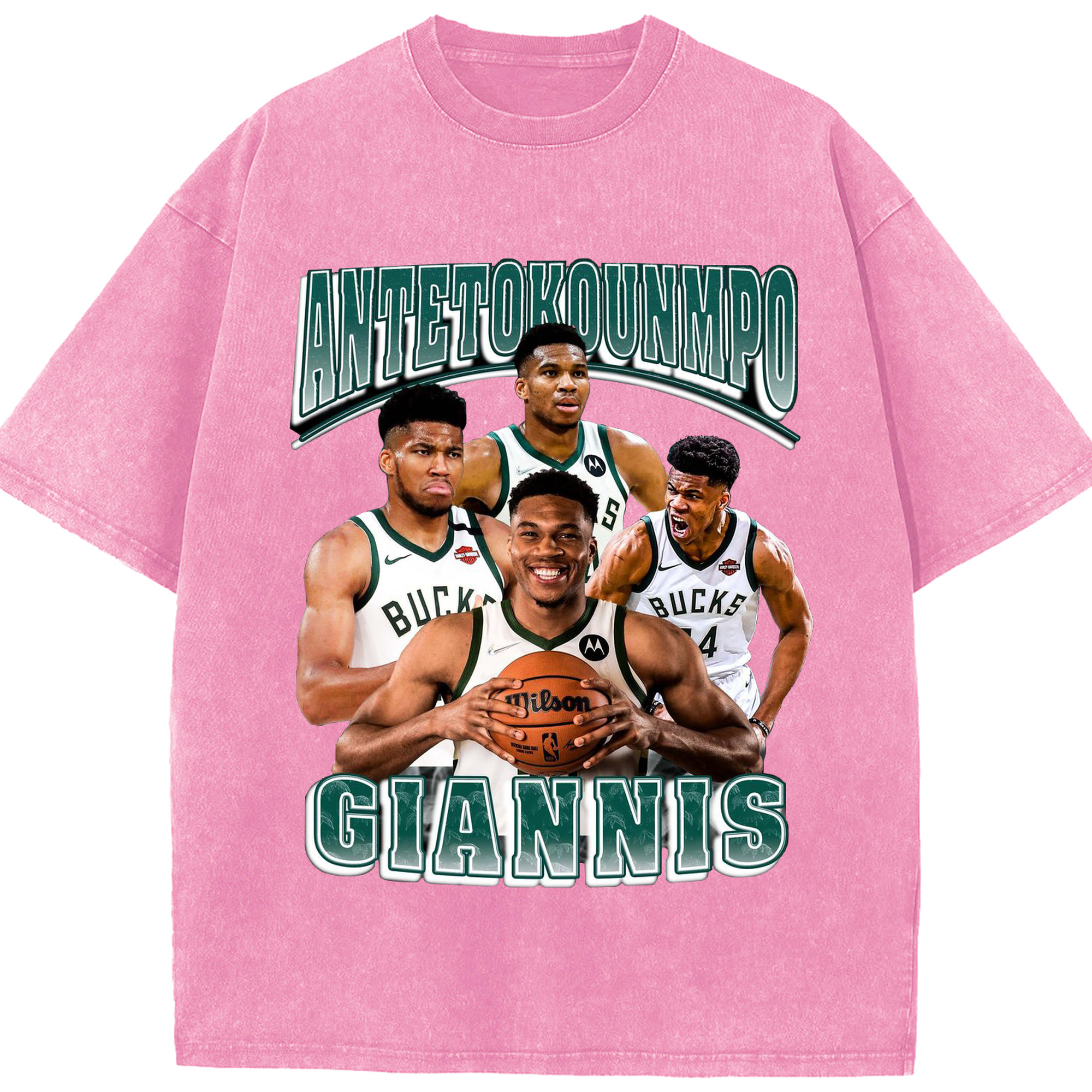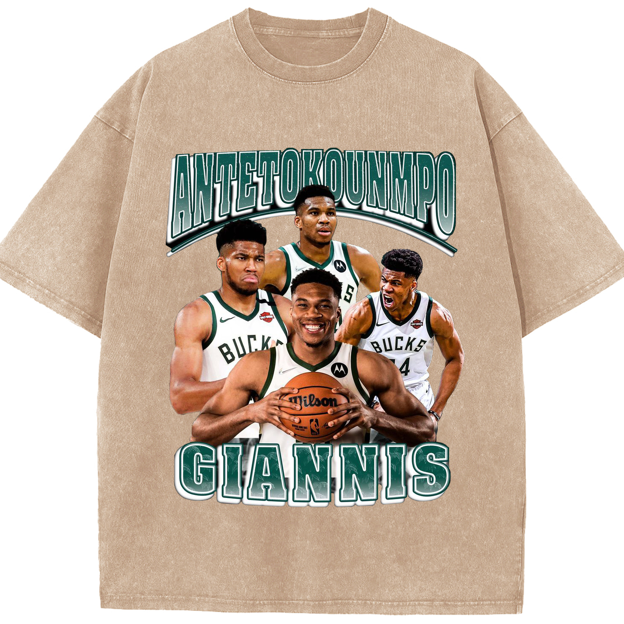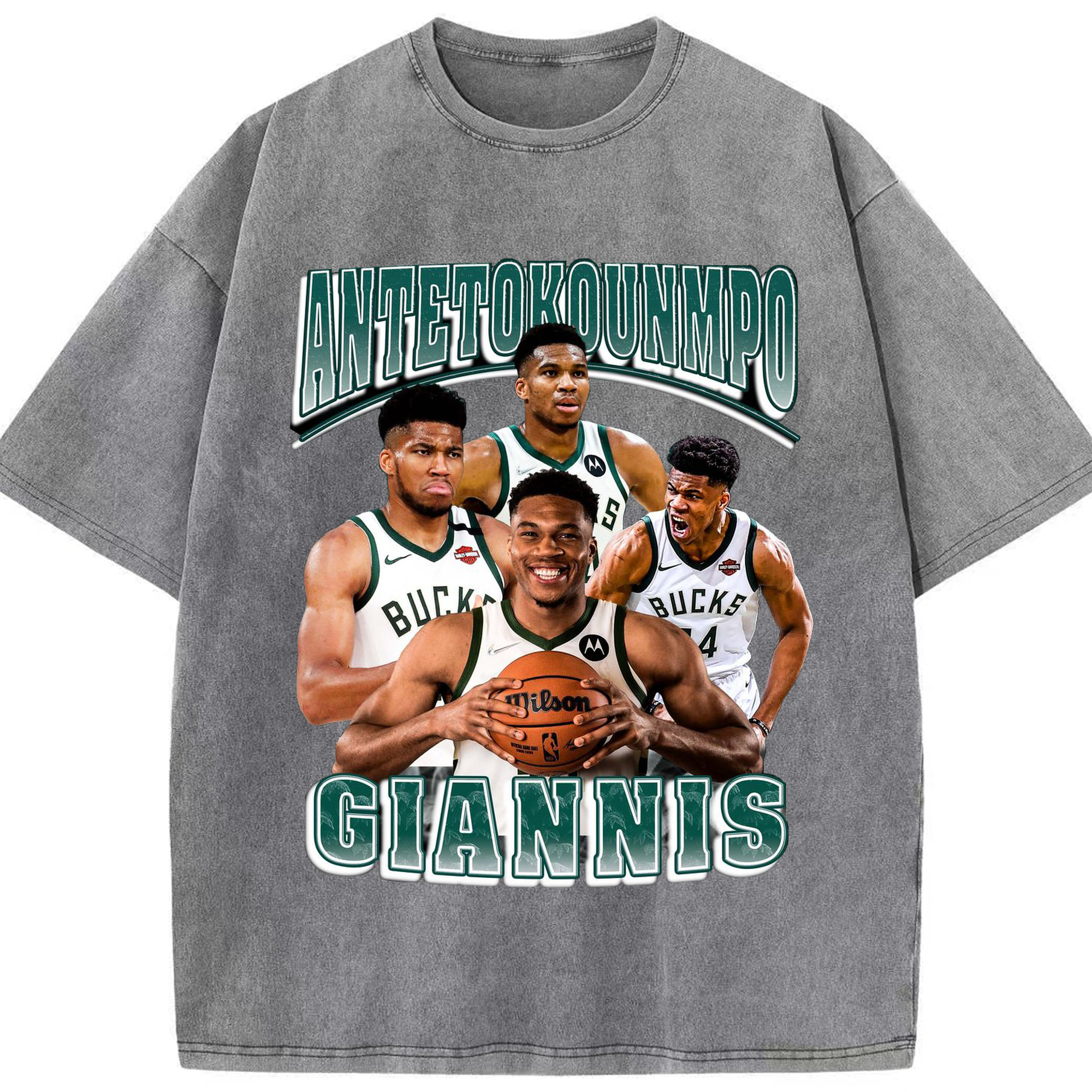 Giannis Antetokounmpo Multi-Pose Fan Shirt - Washed Vintage Look 230g Cotton Oversized T-Shirt With Front Heat Transfer Print – Soft, Lightweight, Stylish Fit – Comfortable Casual Wear For Sports & Everyday Use