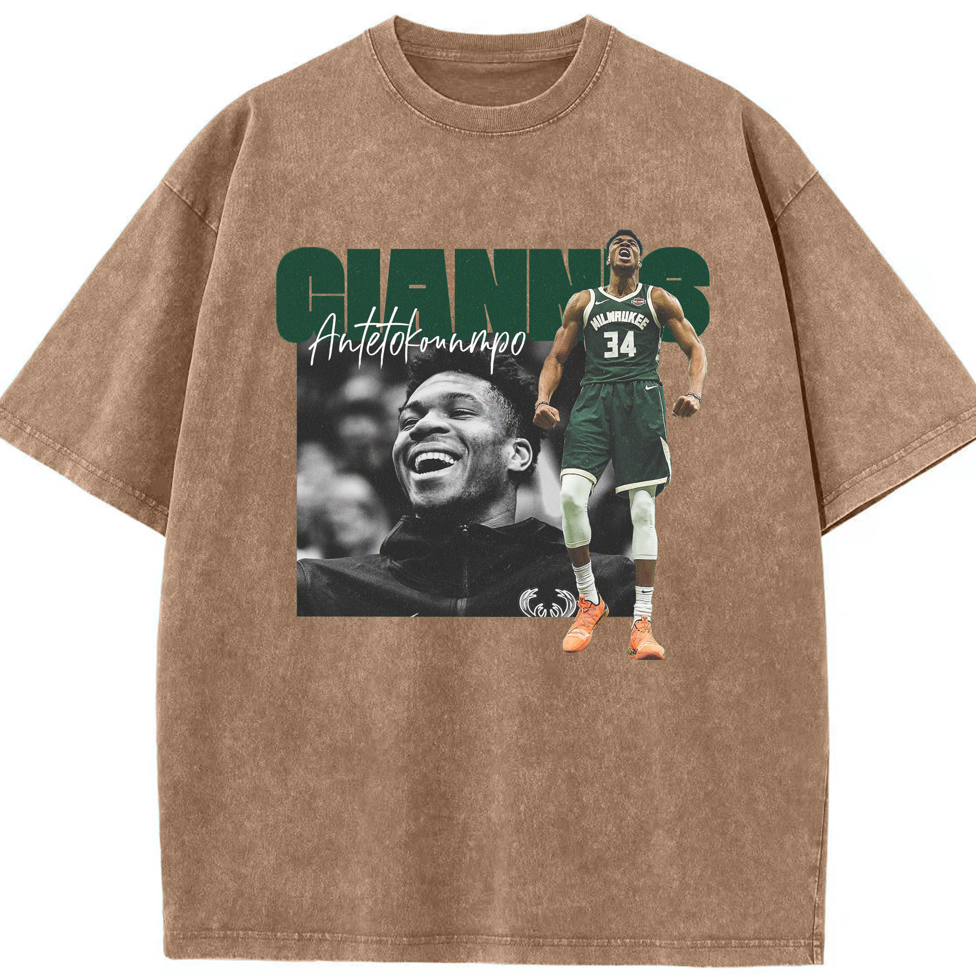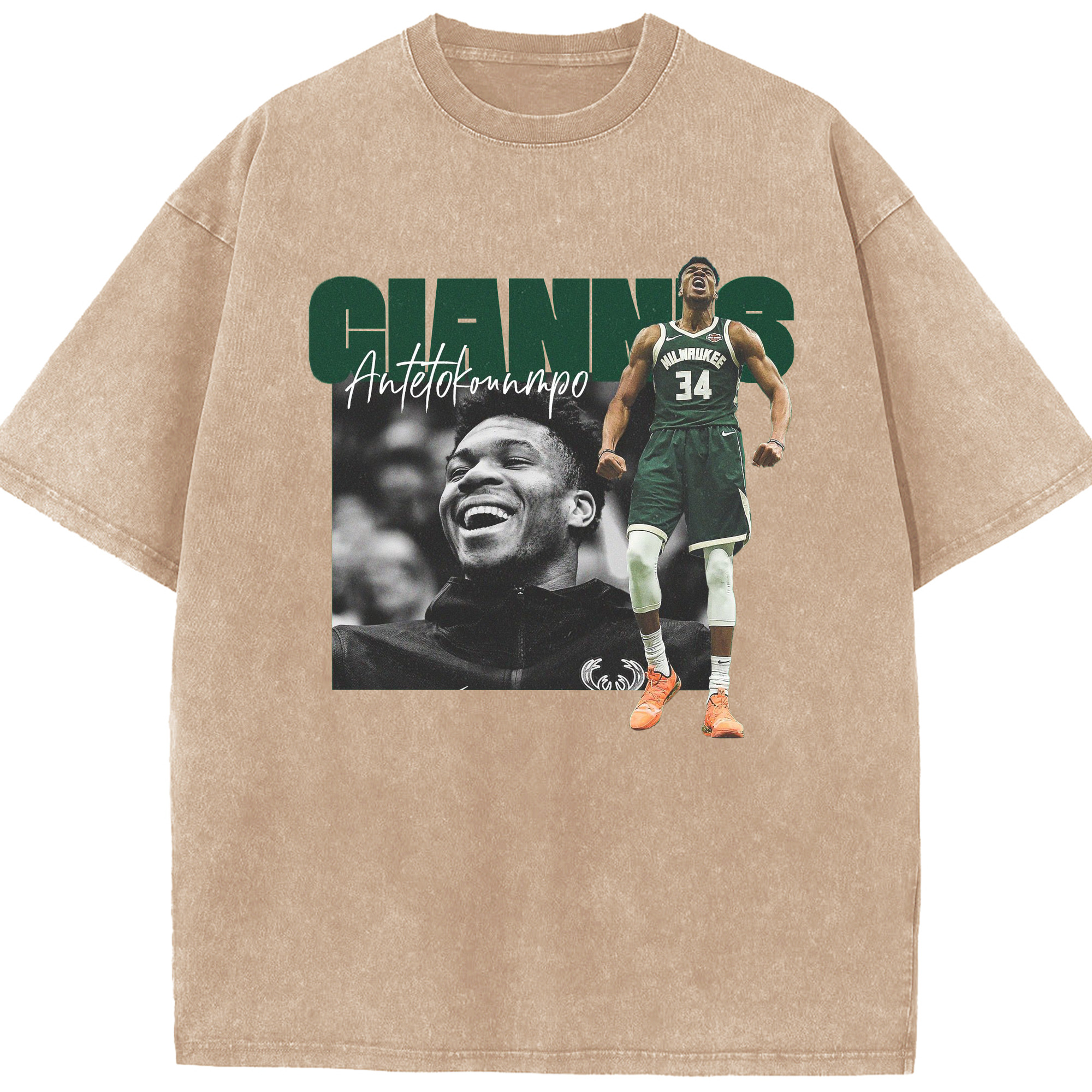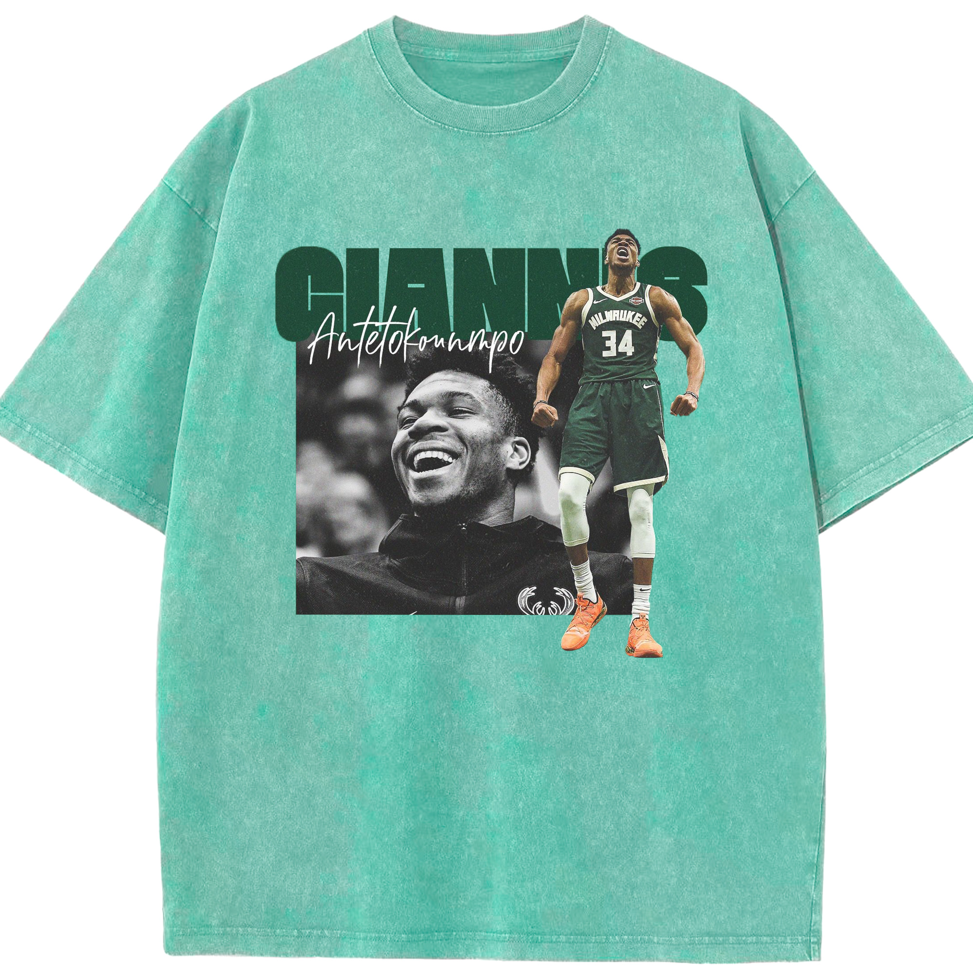 Giannis Antetokounmpo raises his arms to vent - Washed Vintage Look 230g Cotton Oversized T-Shirt With Front Heat Transfer Print – Soft, Lightweight, Stylish Fit – Comfortable Casual Wear For Sports & Everyday Use