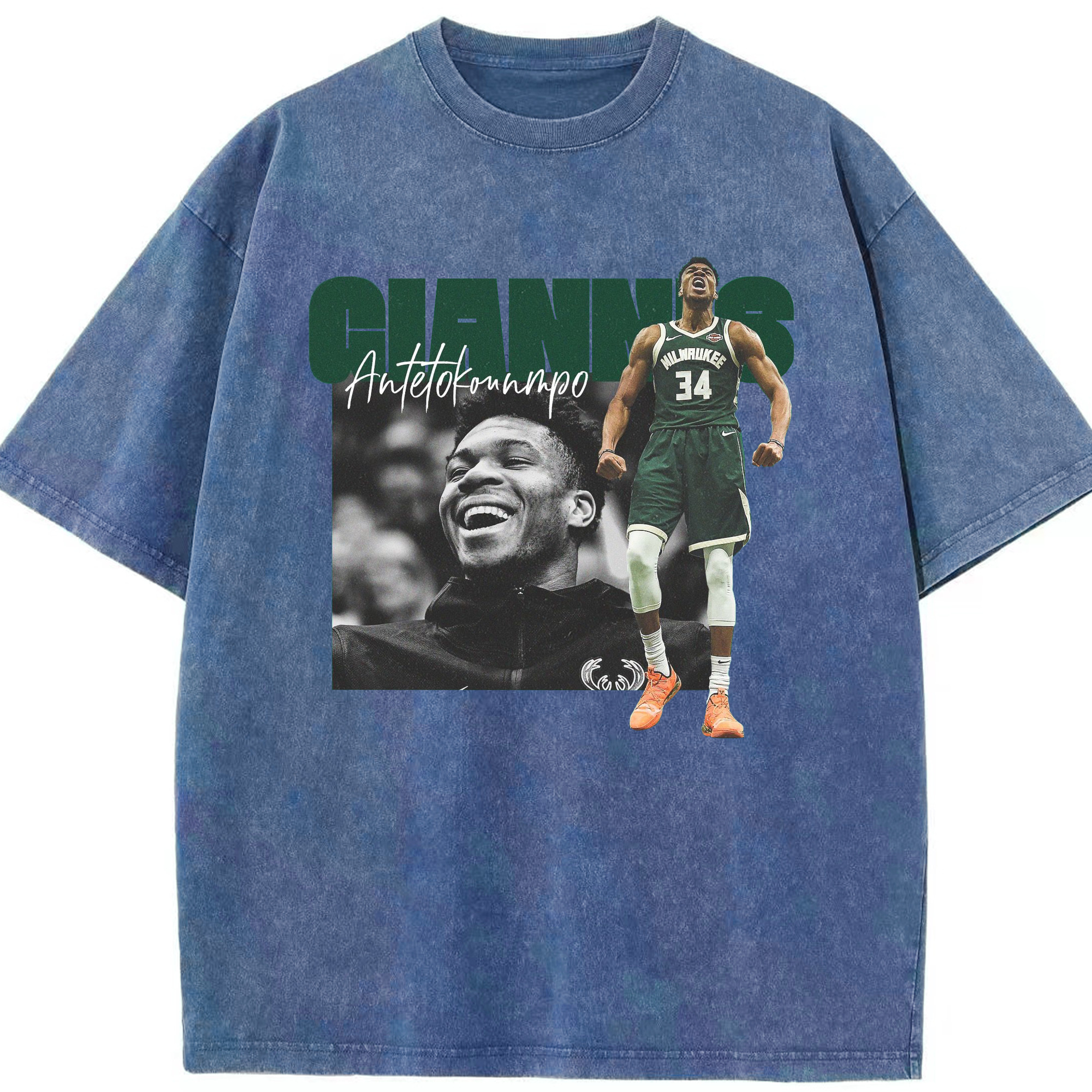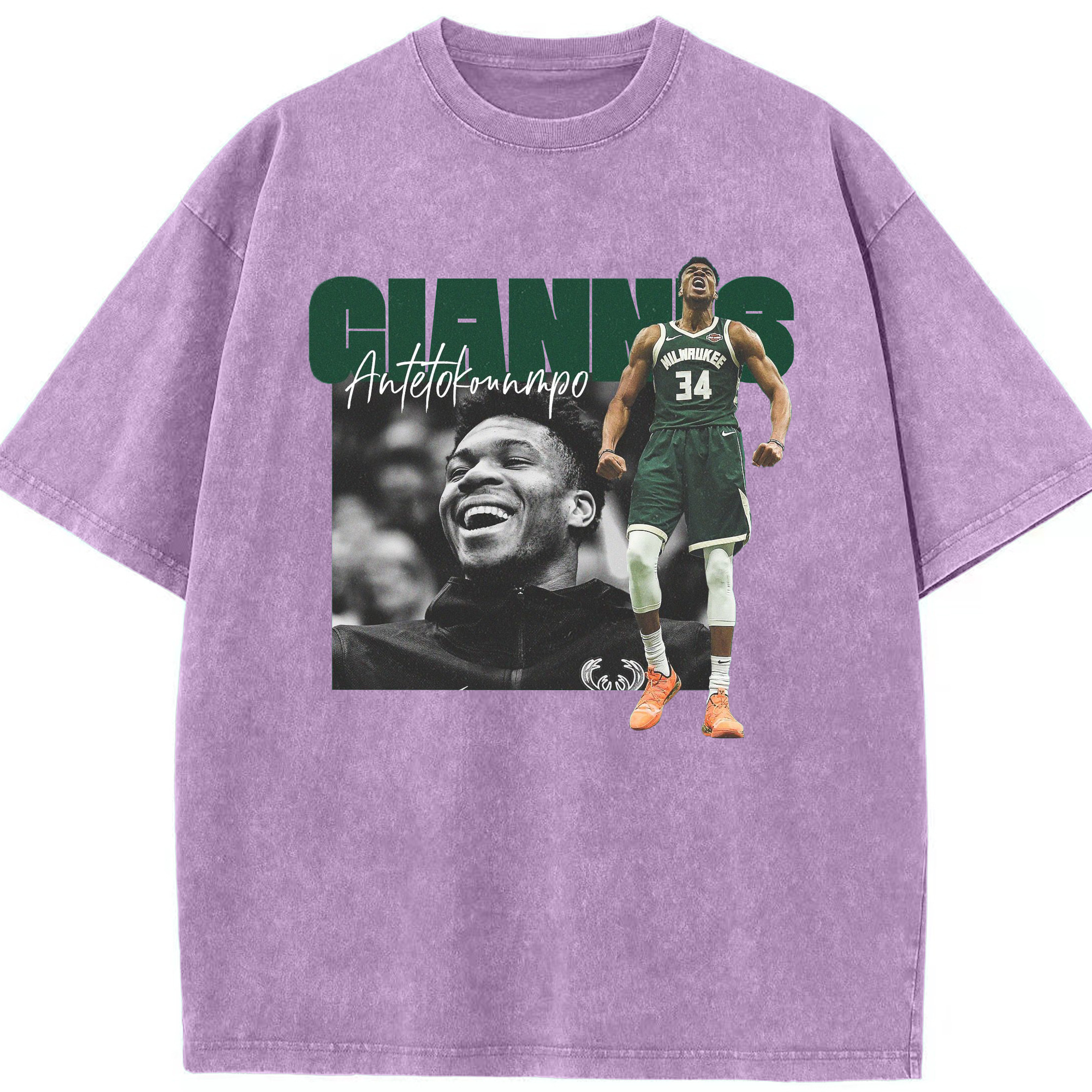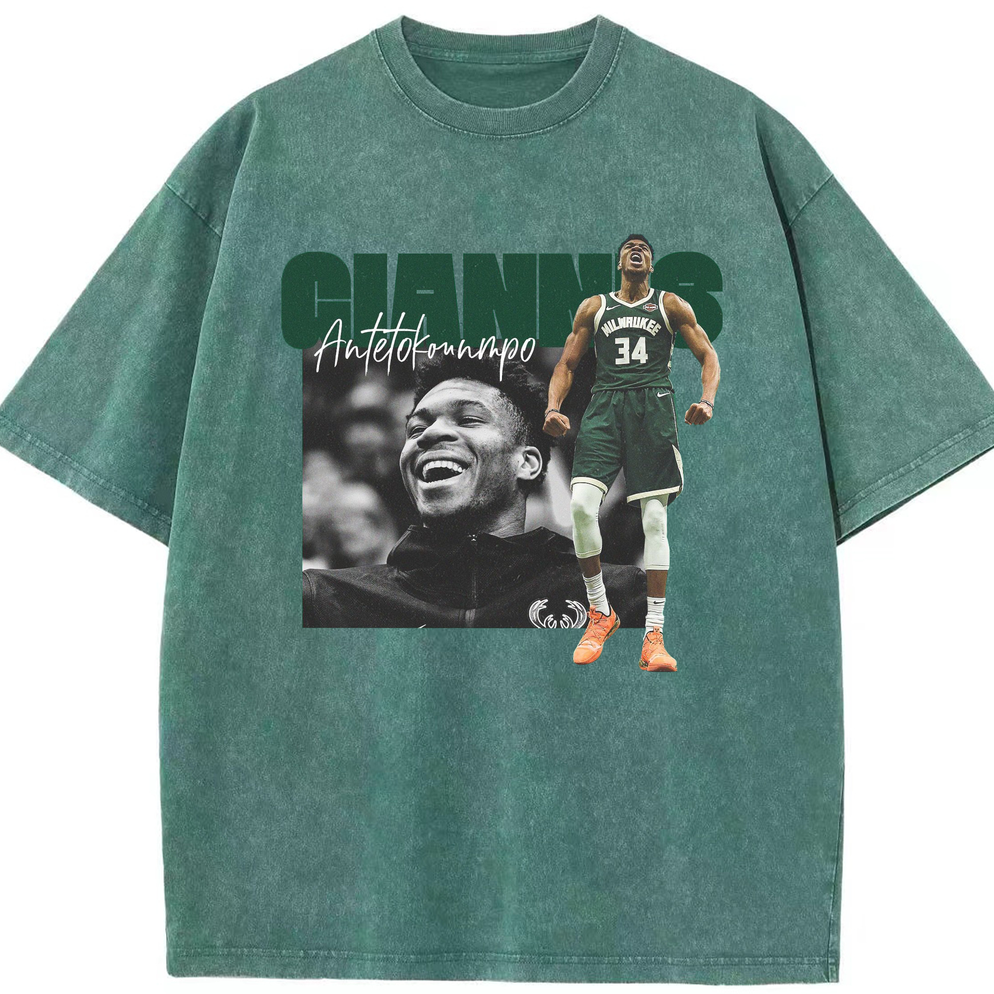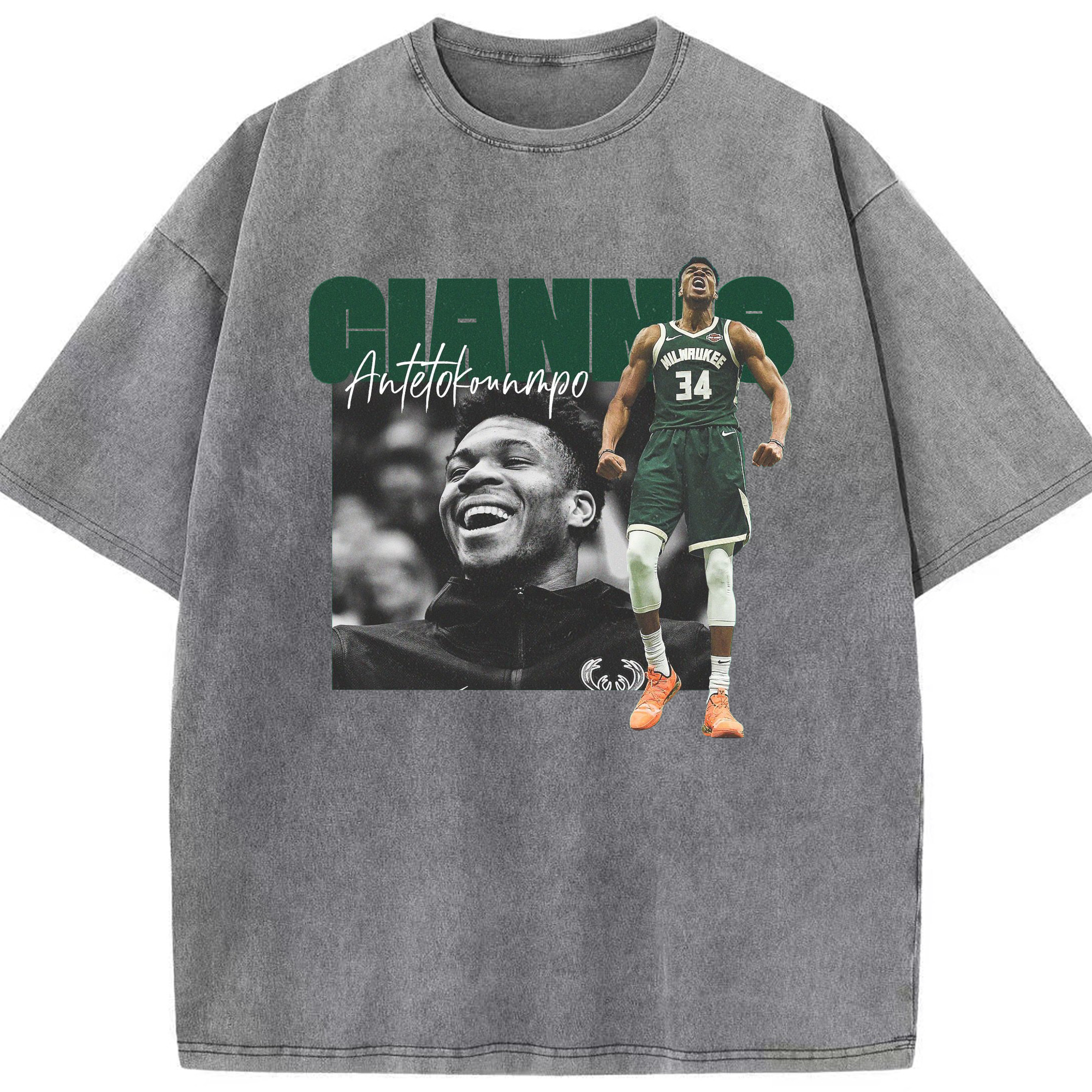 Giannis Antetokounmpo raises his arms to vent - Washed Vintage Look 230g Cotton Oversized T-Shirt With Front Heat Transfer Print – Soft, Lightweight, Stylish Fit – Comfortable Casual Wear For Sports & Everyday Use