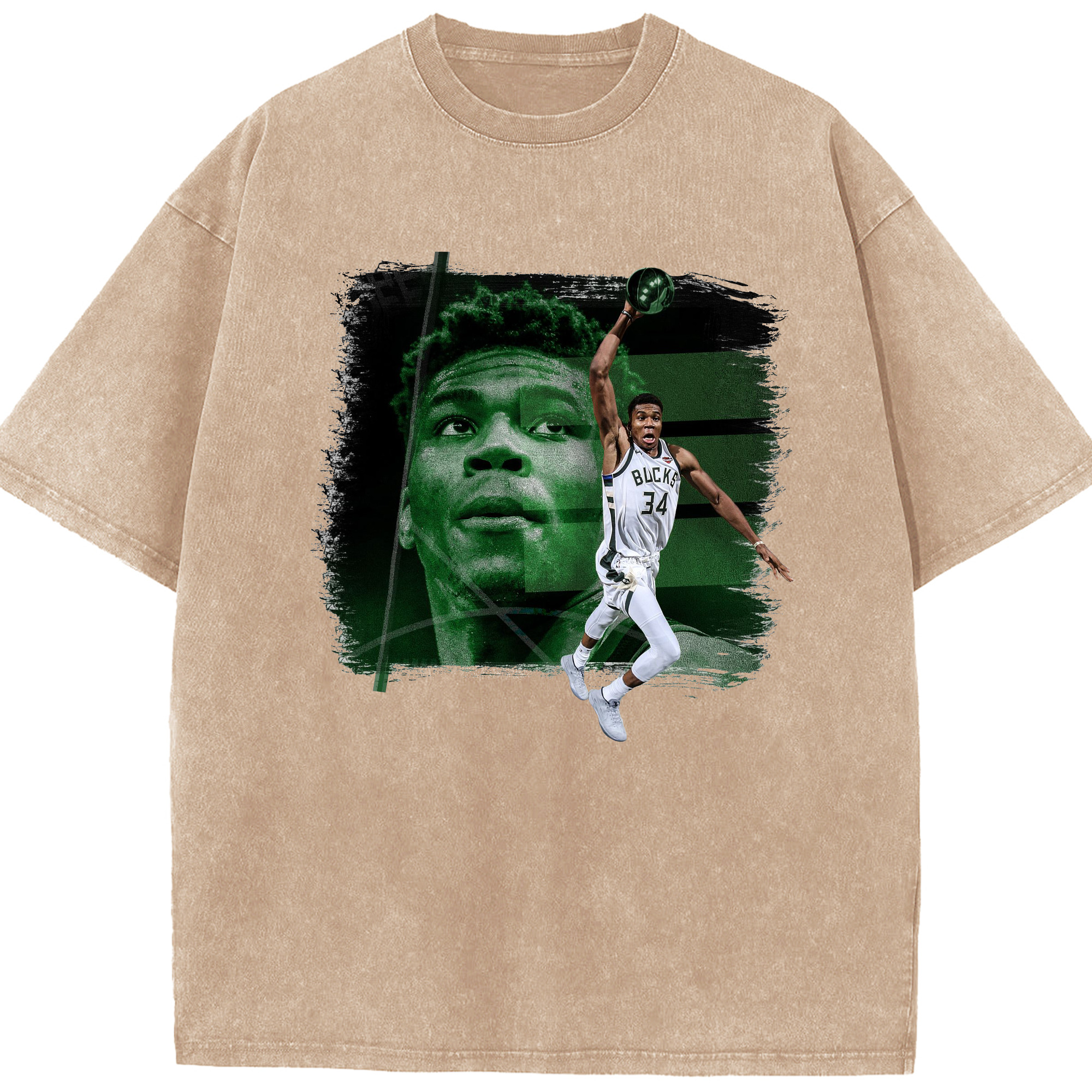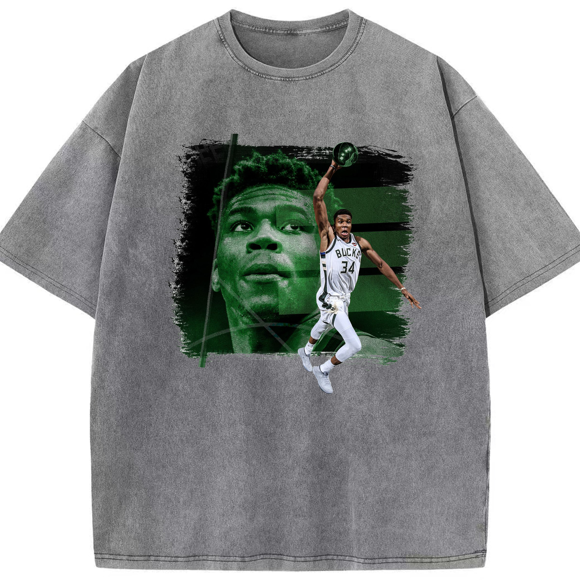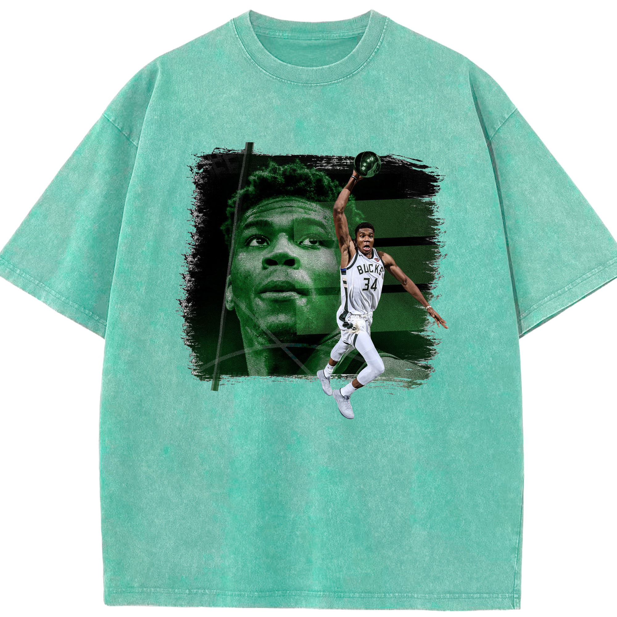 Giannis Antetokounmpo's slam dunk - Washed Vintage Look 230g Cotton Oversized T-Shirt With Front Heat Transfer Print – Soft, Lightweight, Stylish Fit – Comfortable Casual Wear For Sports & Everyday Use