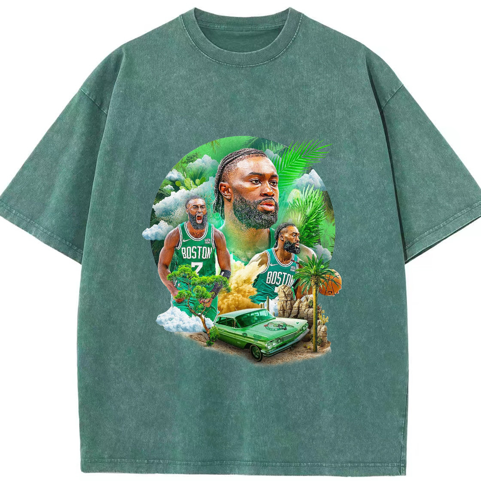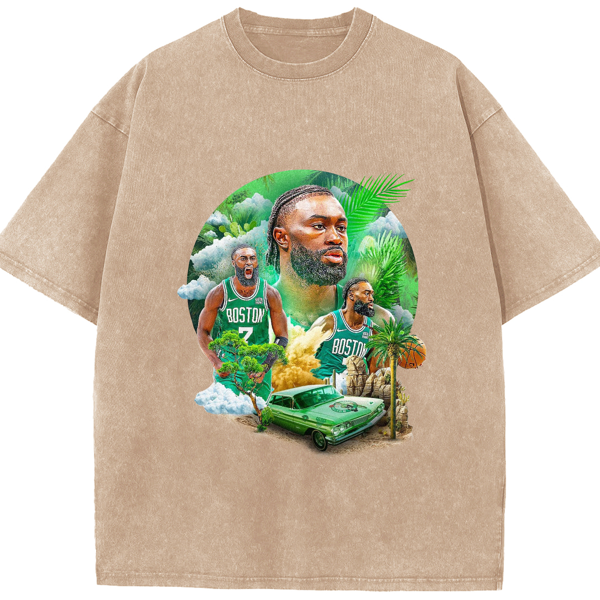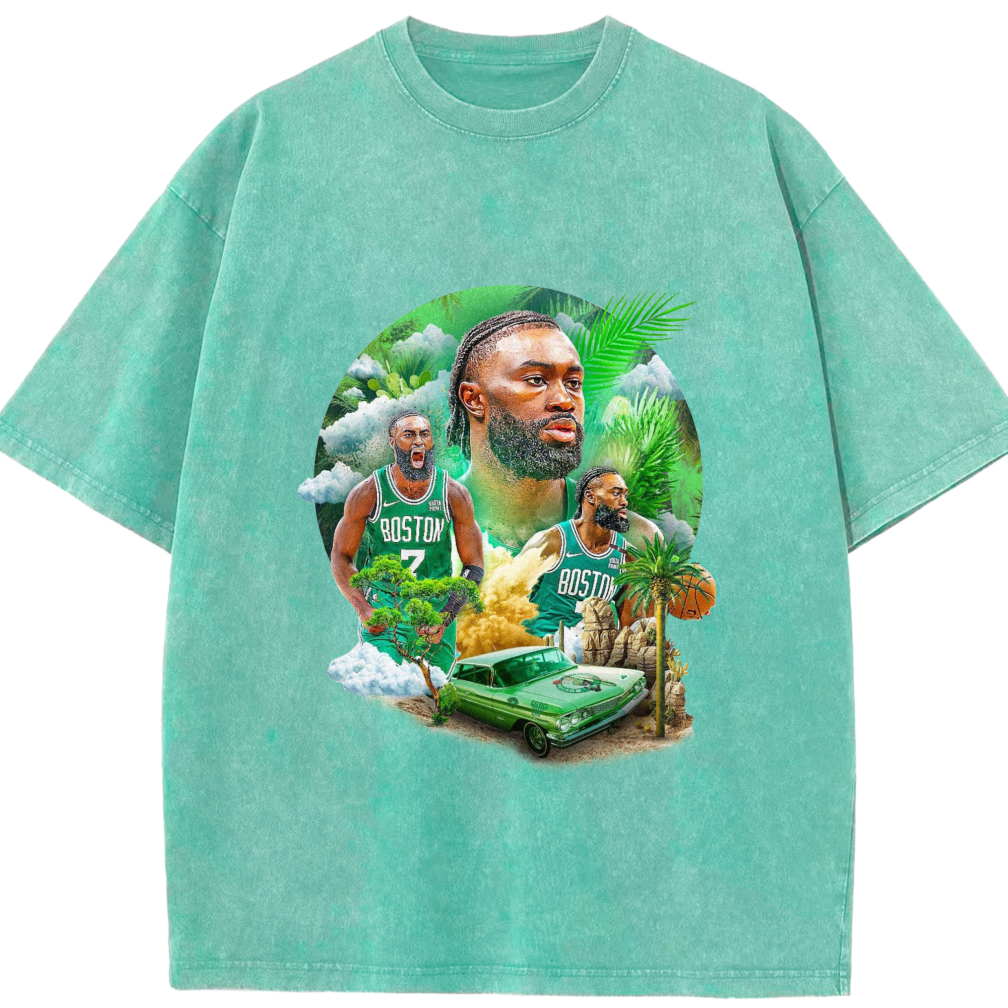 “Island of Green” Jaylen Brown Fantasy Shirt - Washed Vintage Look 230g Cotton Oversized T-Shirt With Front Heat Transfer Print – Soft, Lightweight, Stylish Fit – Comfortable Casual Wear For Sports & Everyday Use