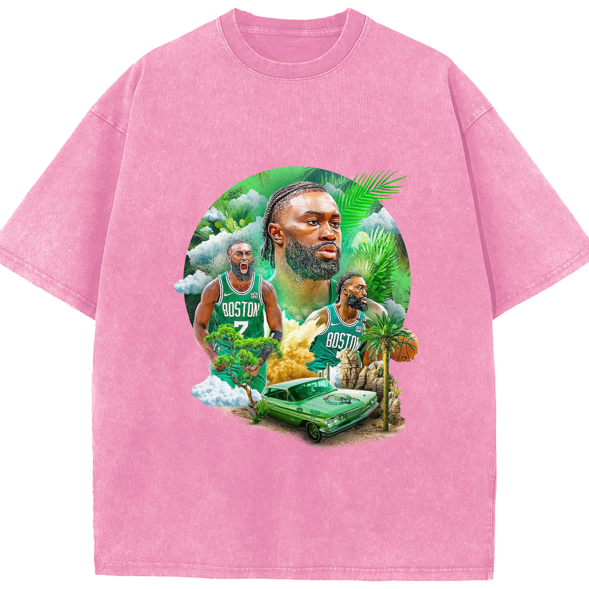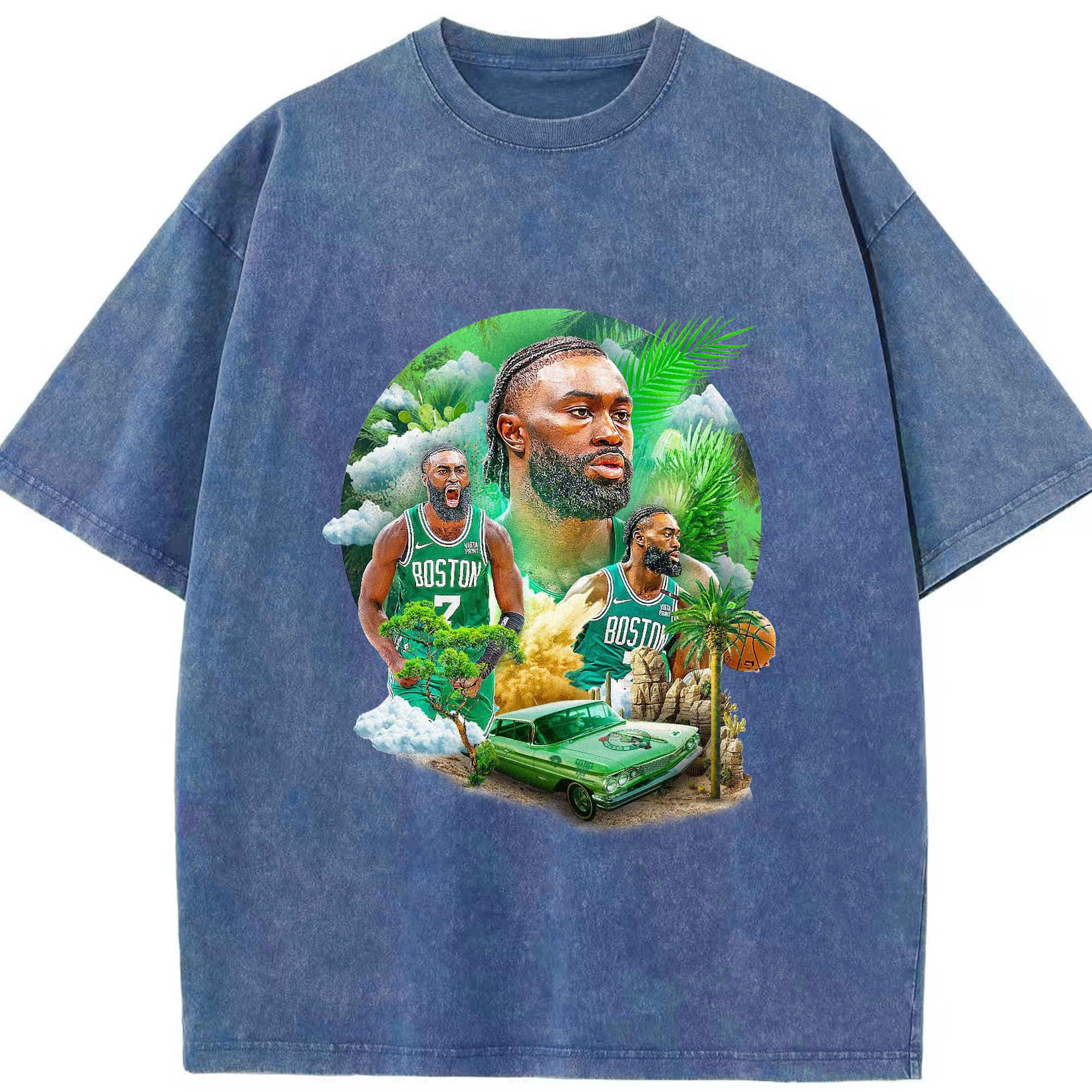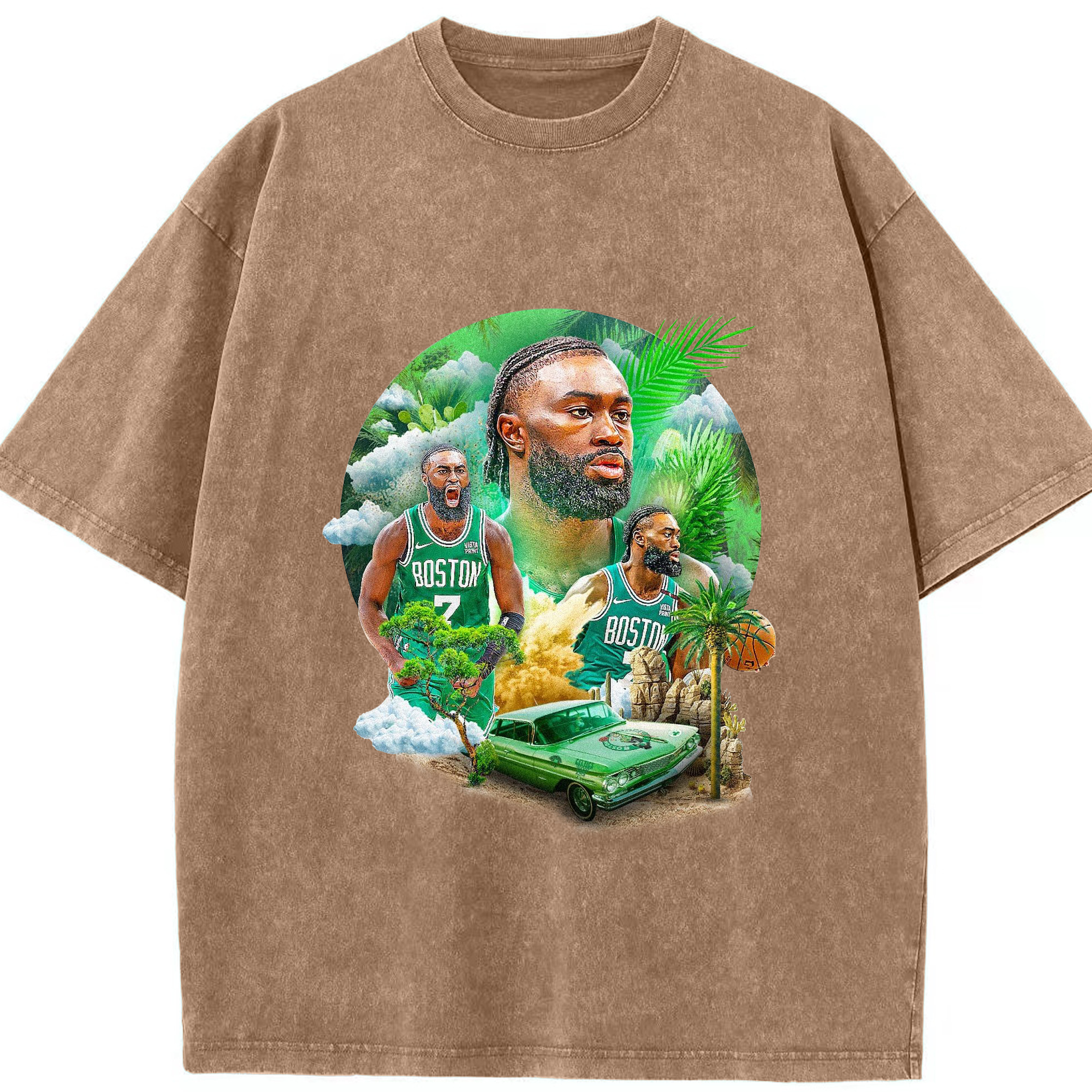 “Island of Green” Jaylen Brown Fantasy Shirt - Washed Vintage Look 230g Cotton Oversized T-Shirt With Front Heat Transfer Print – Soft, Lightweight, Stylish Fit – Comfortable Casual Wear For Sports & Everyday Use