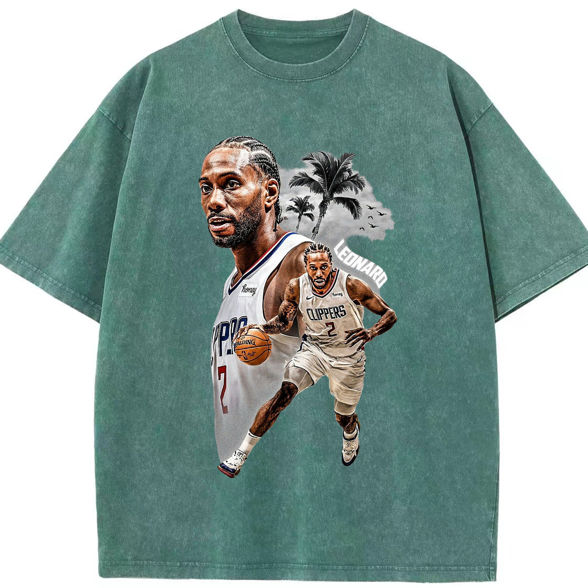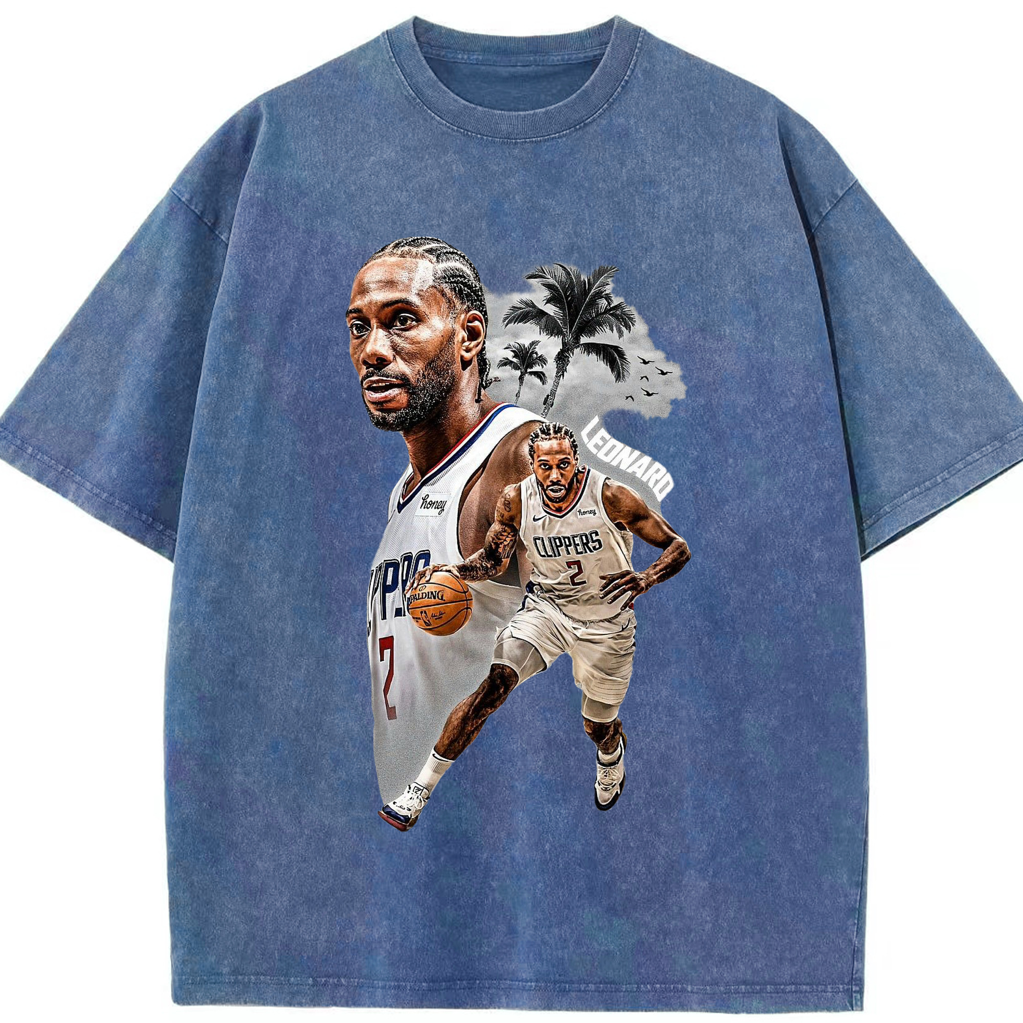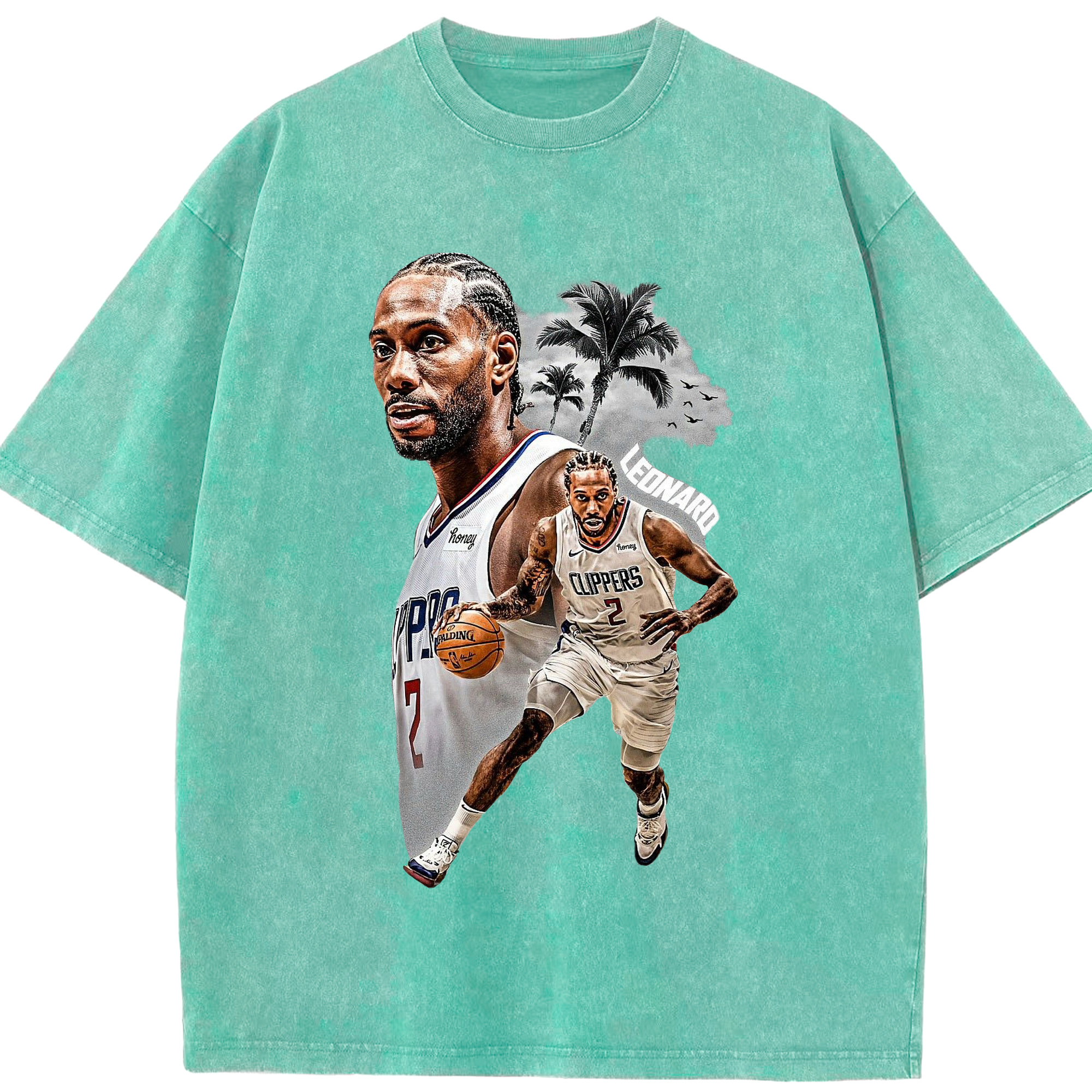 Kawhi Leonard LA Clippers On - Court Palm Tree Style Shirt - Washed Vintage Look 230g Cotton Oversized T-Shirt With Front Heat Transfer Print – Soft, Lightweight, Stylish Fit – Comfortable Casual Wear For Sports & Everyday Use