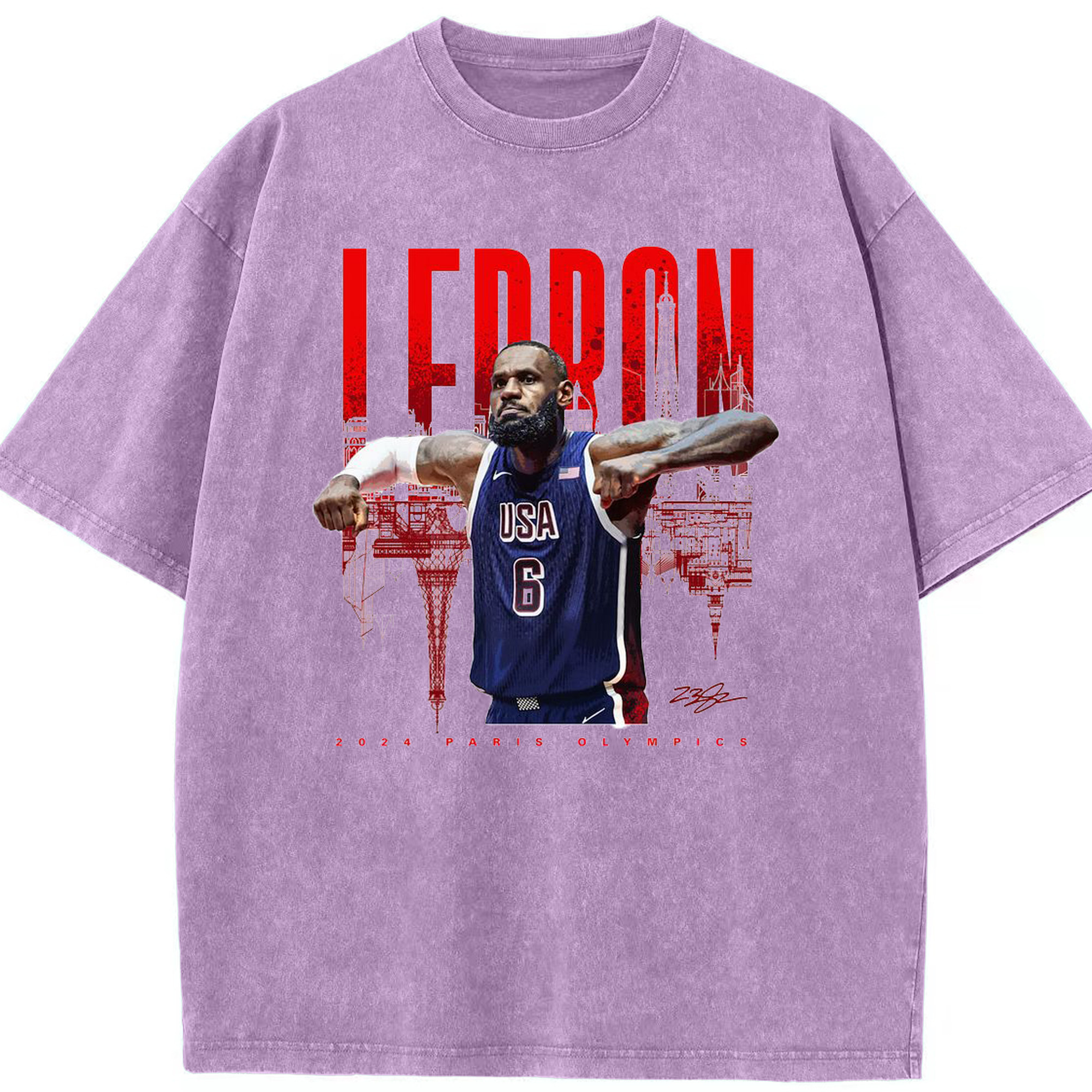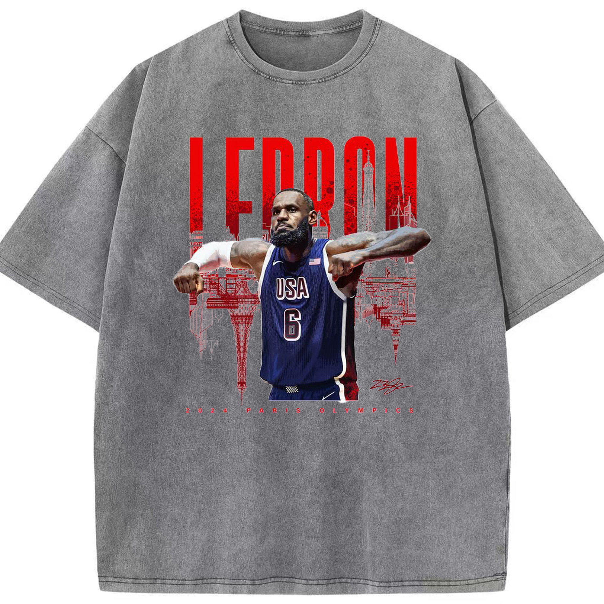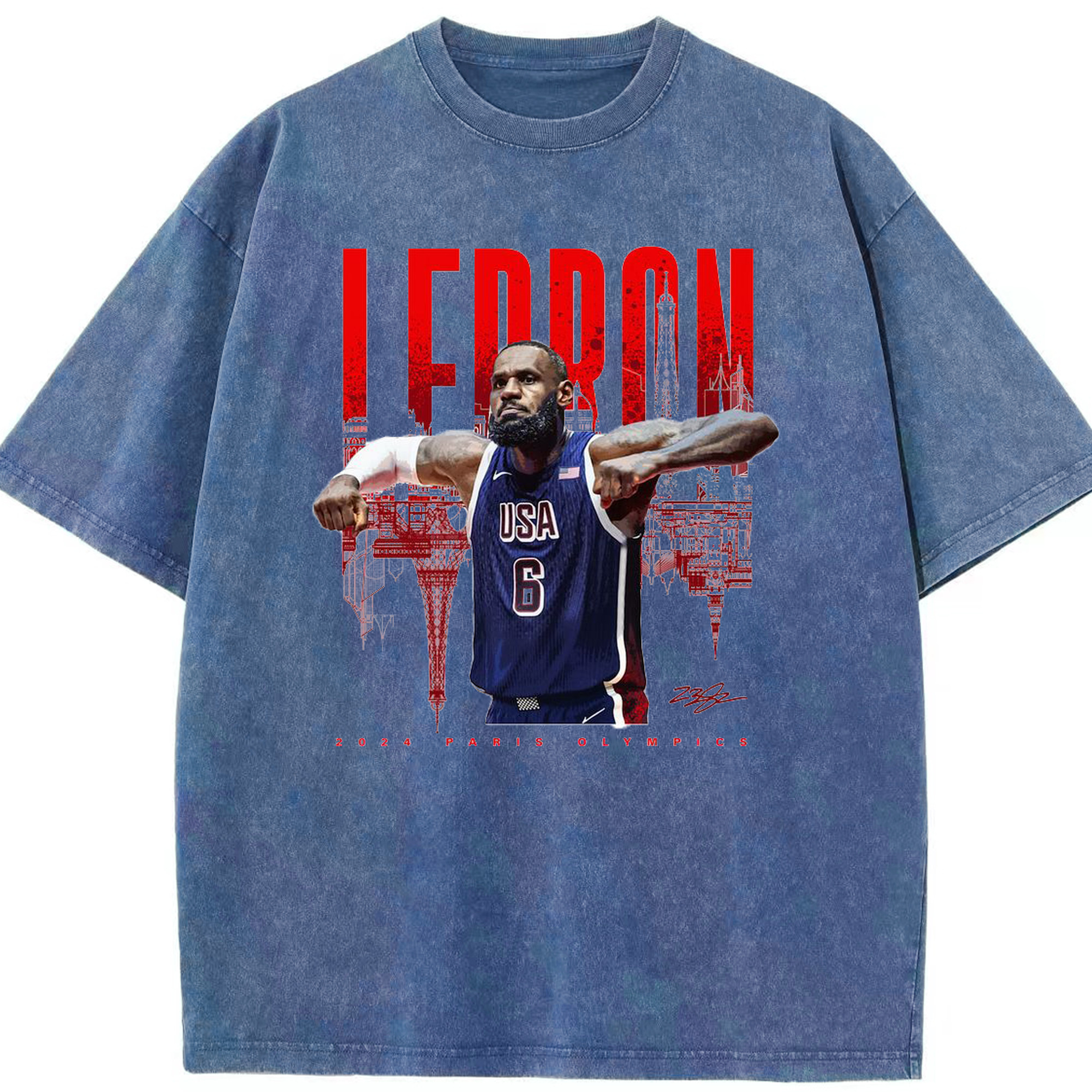 LeBron James 2024 Paris Olympics USA Jersey Shirt - Washed Vintage Look 230g Cotton Oversized T-Shirt With Front Heat Transfer Print – Soft, Lightweight, Stylish Fit – Comfortable Casual Wear For Sports & Everyday Use
