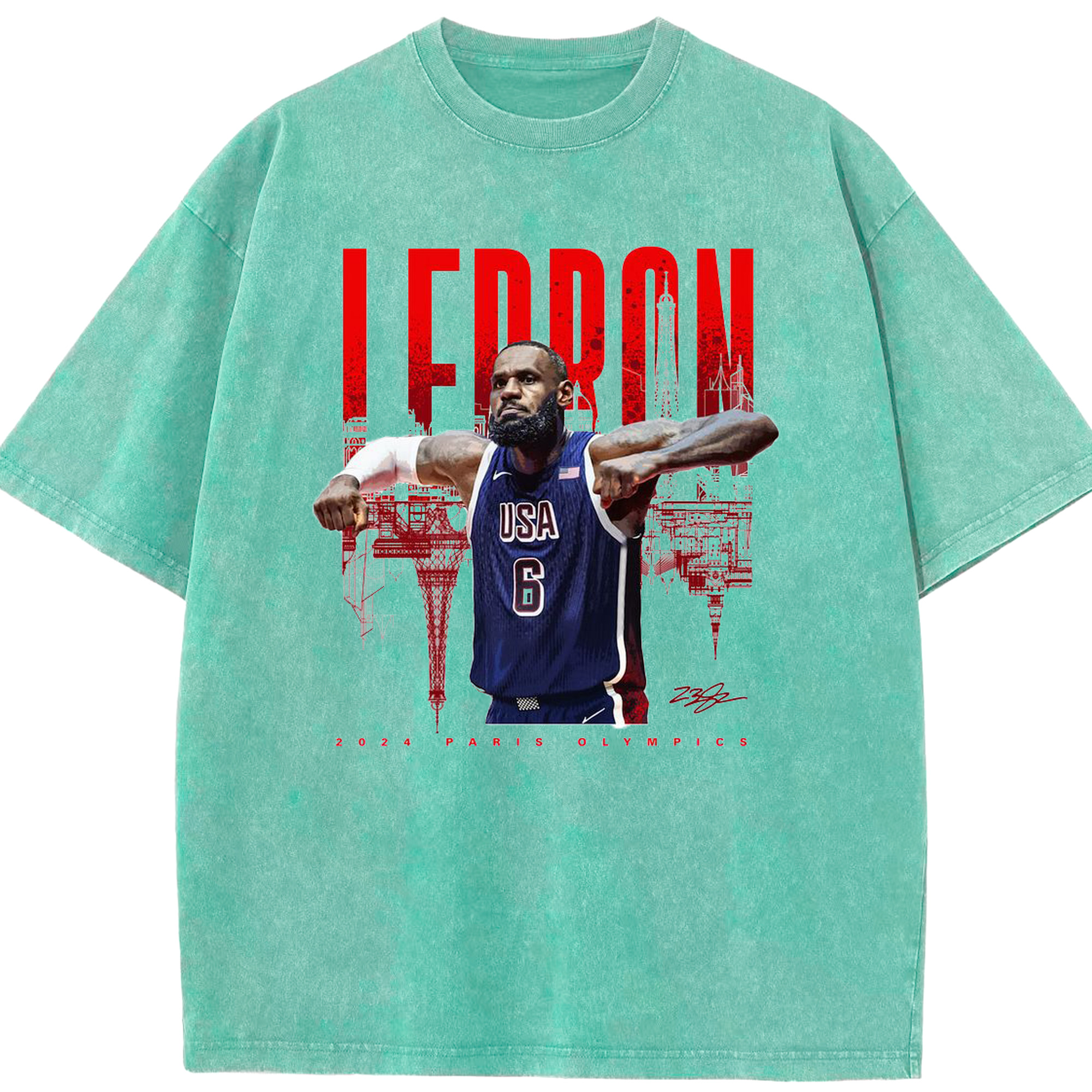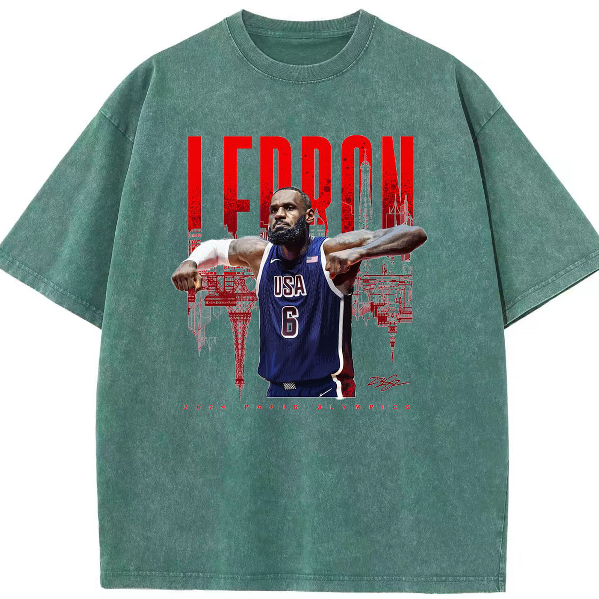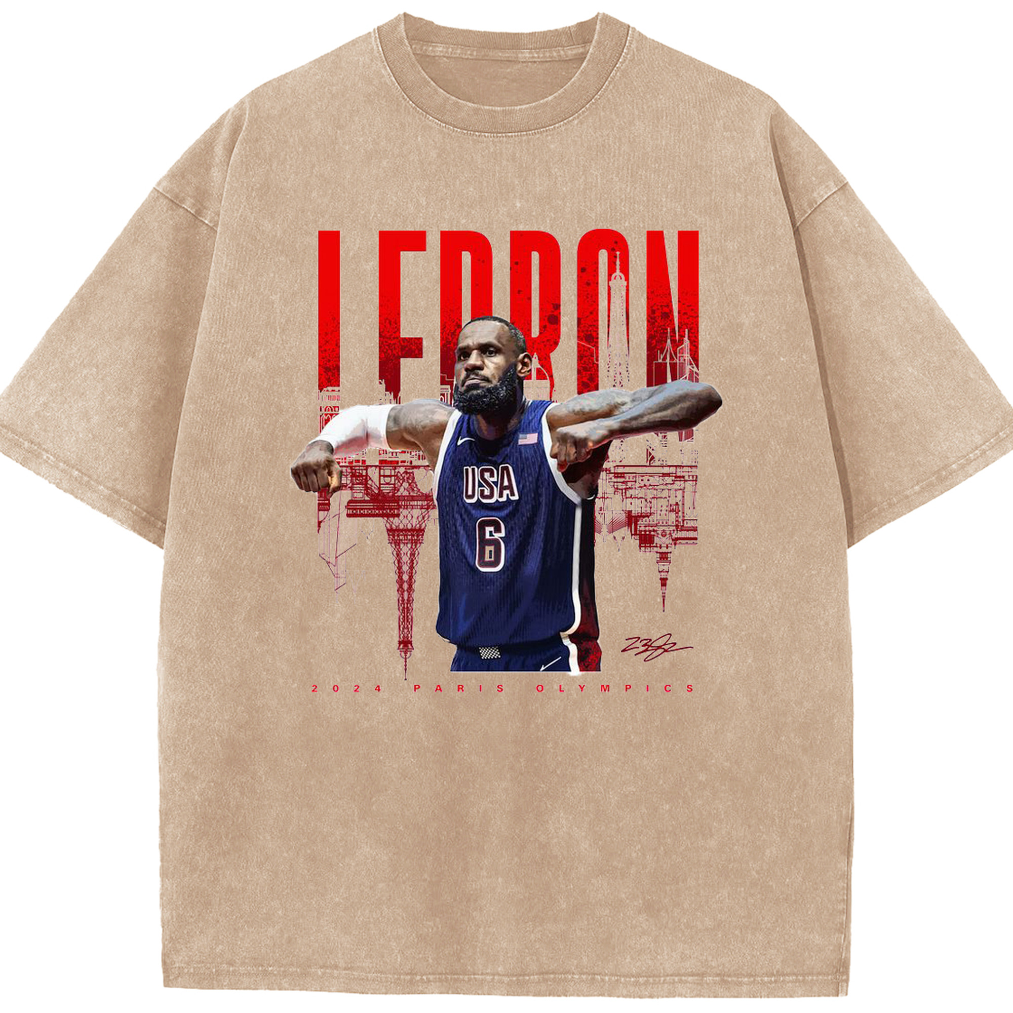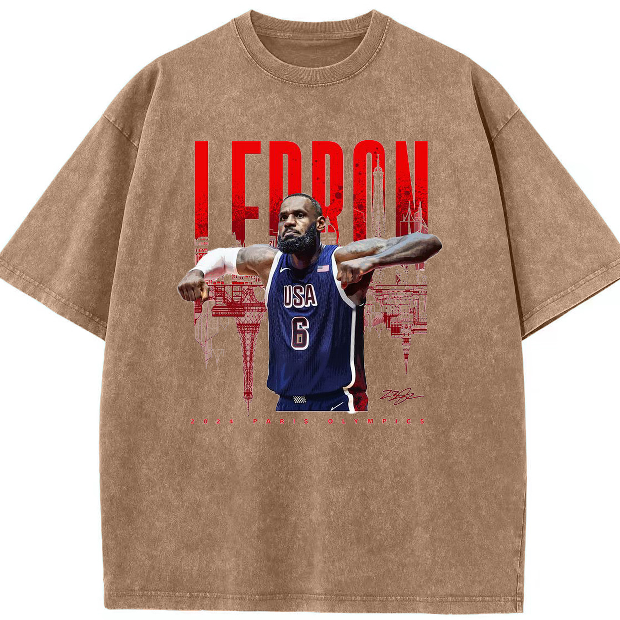 LeBron James 2024 Paris Olympics USA Jersey Shirt - Washed Vintage Look 230g Cotton Oversized T-Shirt With Front Heat Transfer Print – Soft, Lightweight, Stylish Fit – Comfortable Casual Wear For Sports & Everyday Use