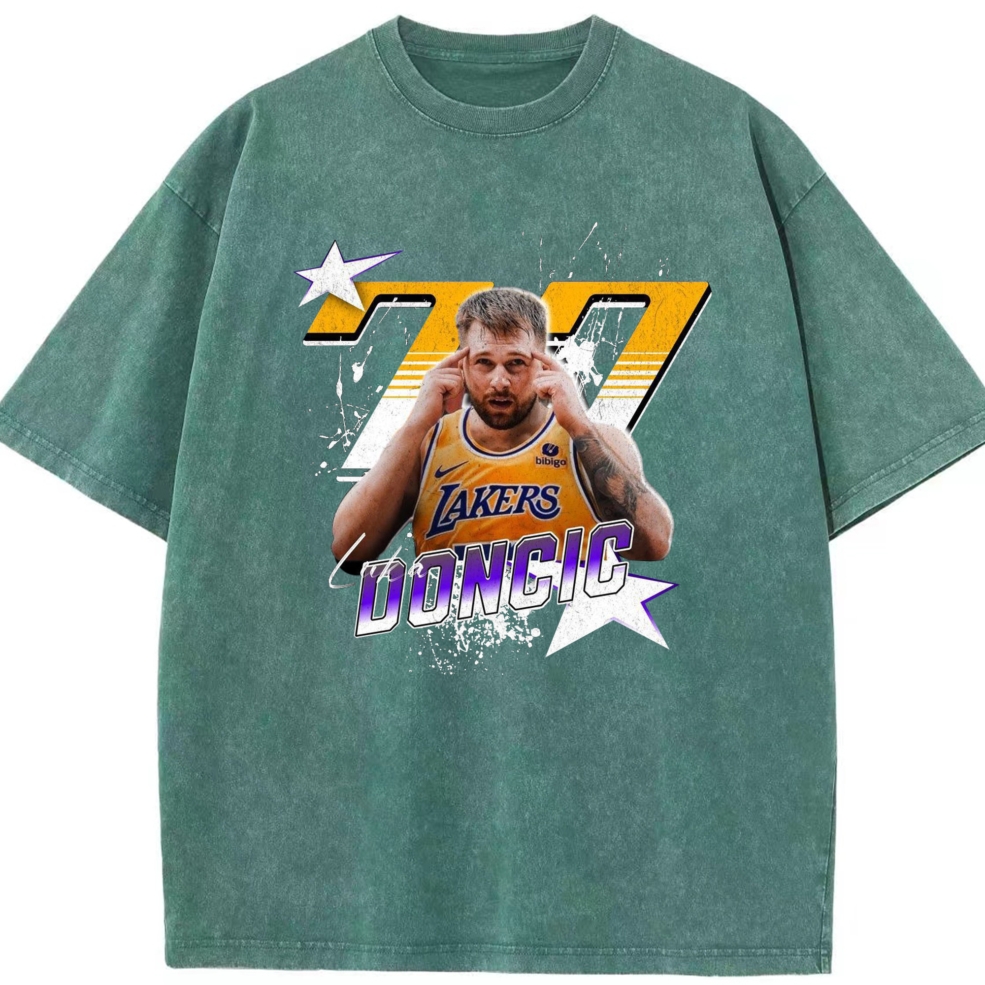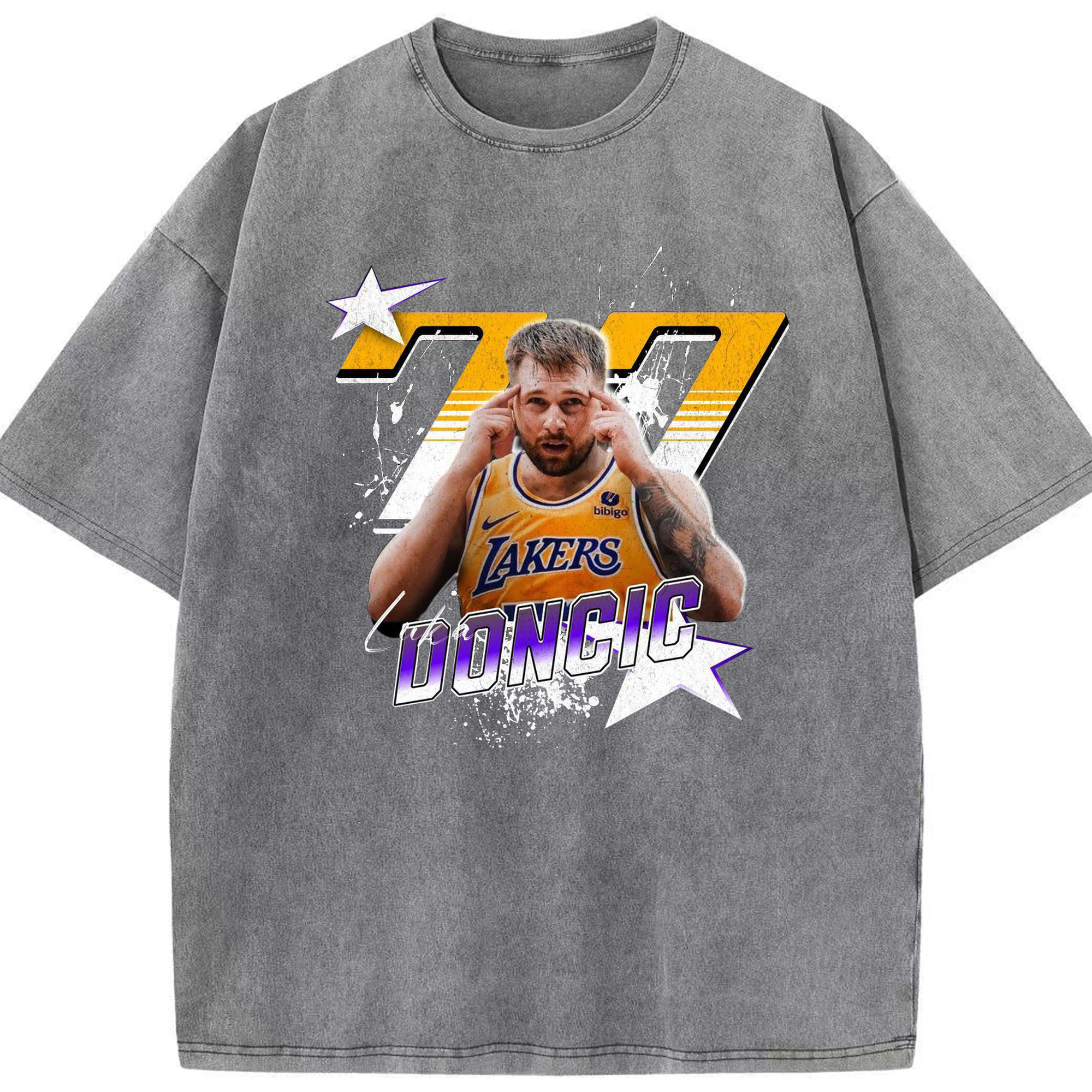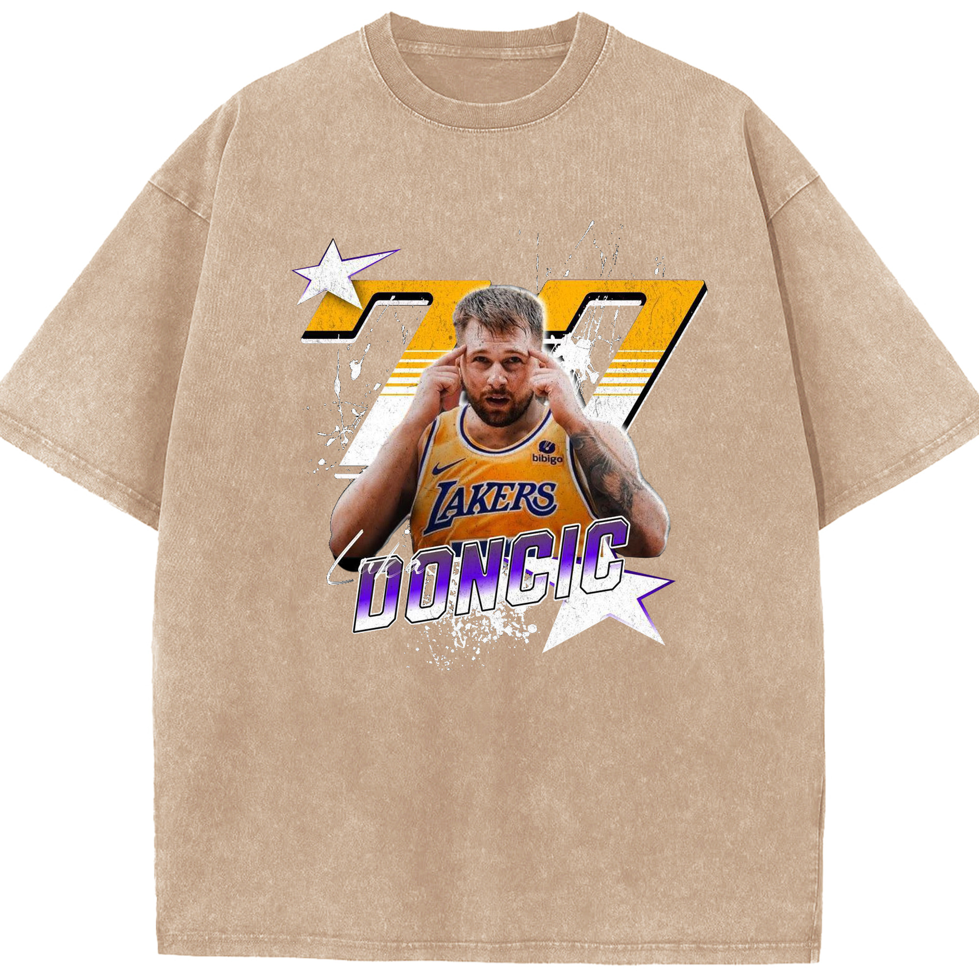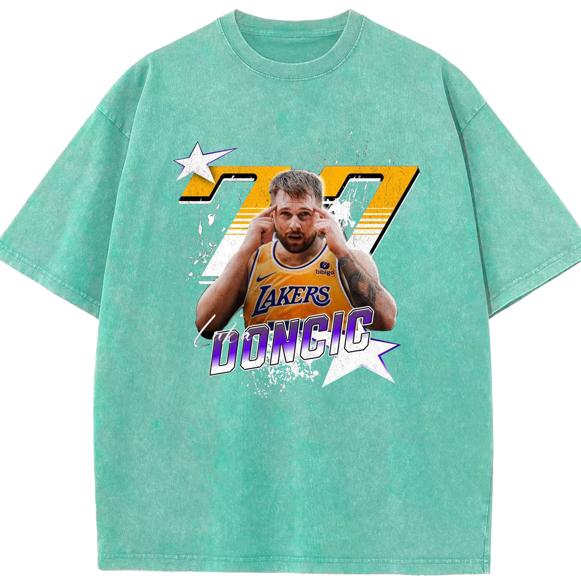 Luka Dončić 77 Uniting Luka’s Magic with LA Lakers Shirt - Washed Vintage Look 230g Cotton Oversized T-Shirt With Front Heat Transfer Print – Soft, Lightweight, Stylish Fit – Comfortable Casual Wear For Sports & Everyday Use
