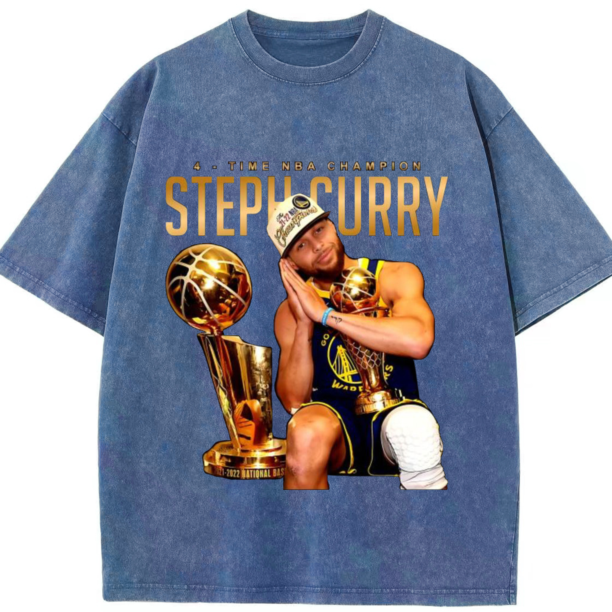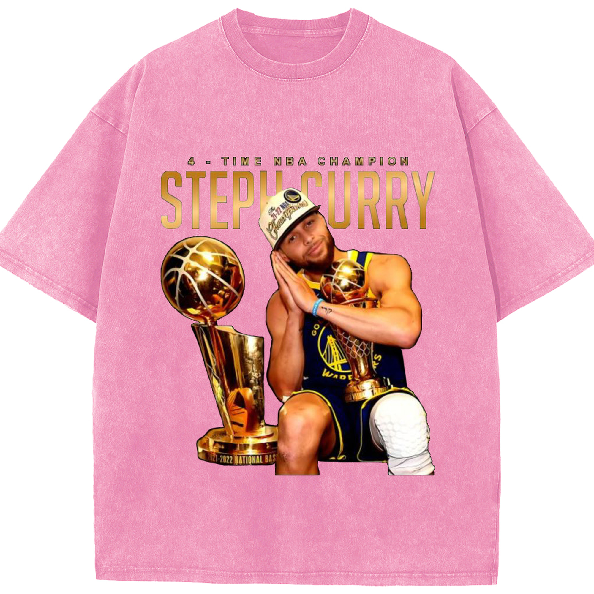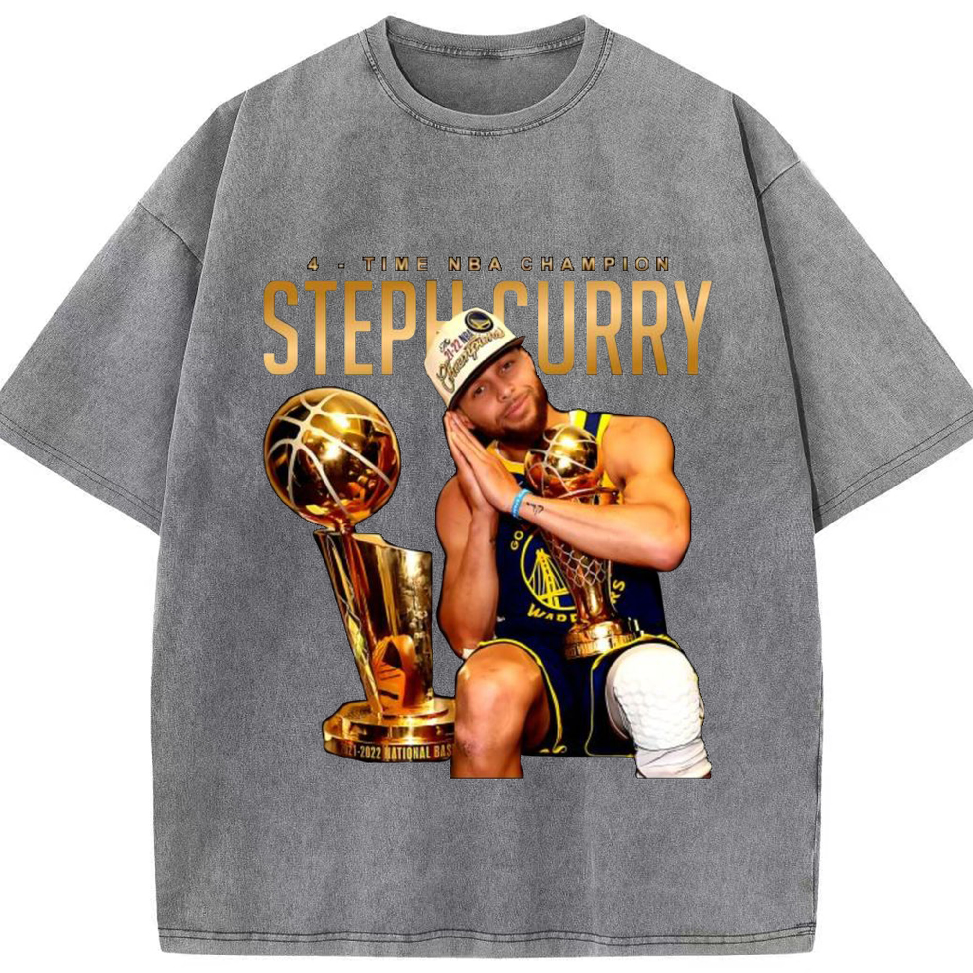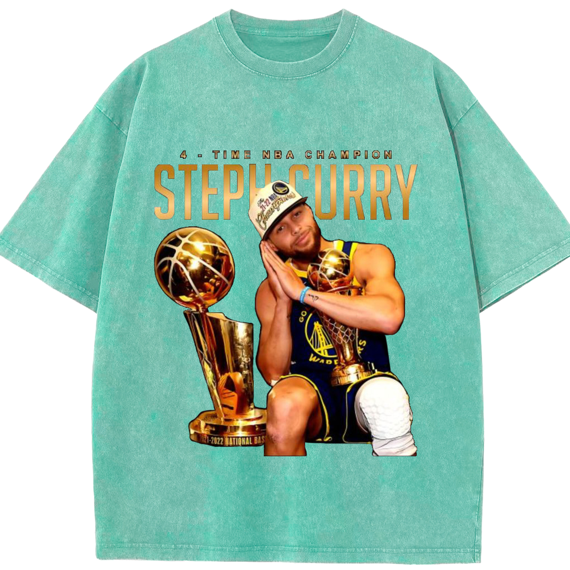 Stephen Curry 4-Time NBA Champion Shirt - Washed Vintage Look 230g Cotton Oversized T-Shirt With Front Heat Transfer Print – Soft, Lightweight, Stylish Fit – Comfortable Casual Wear For Sports & Everyday Use