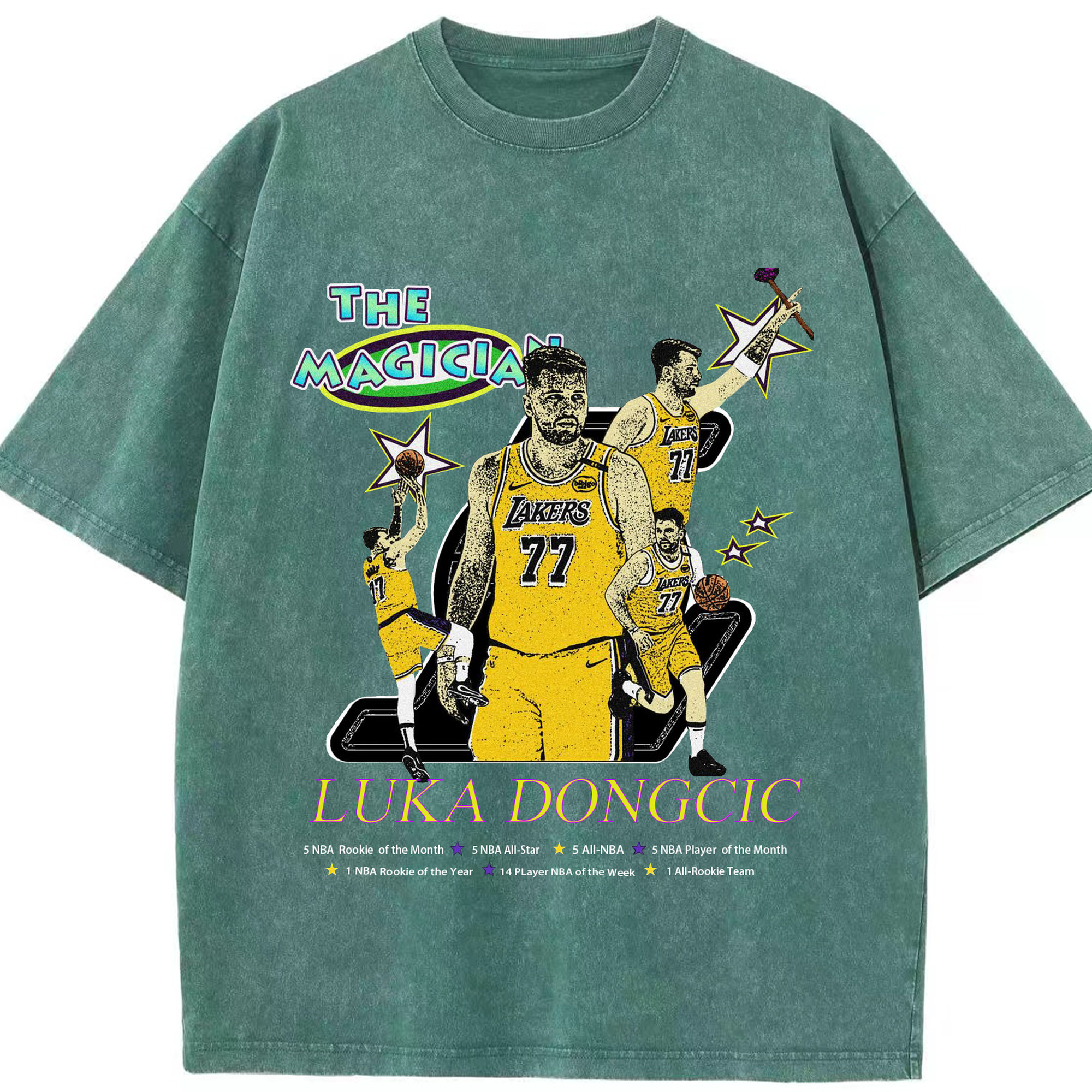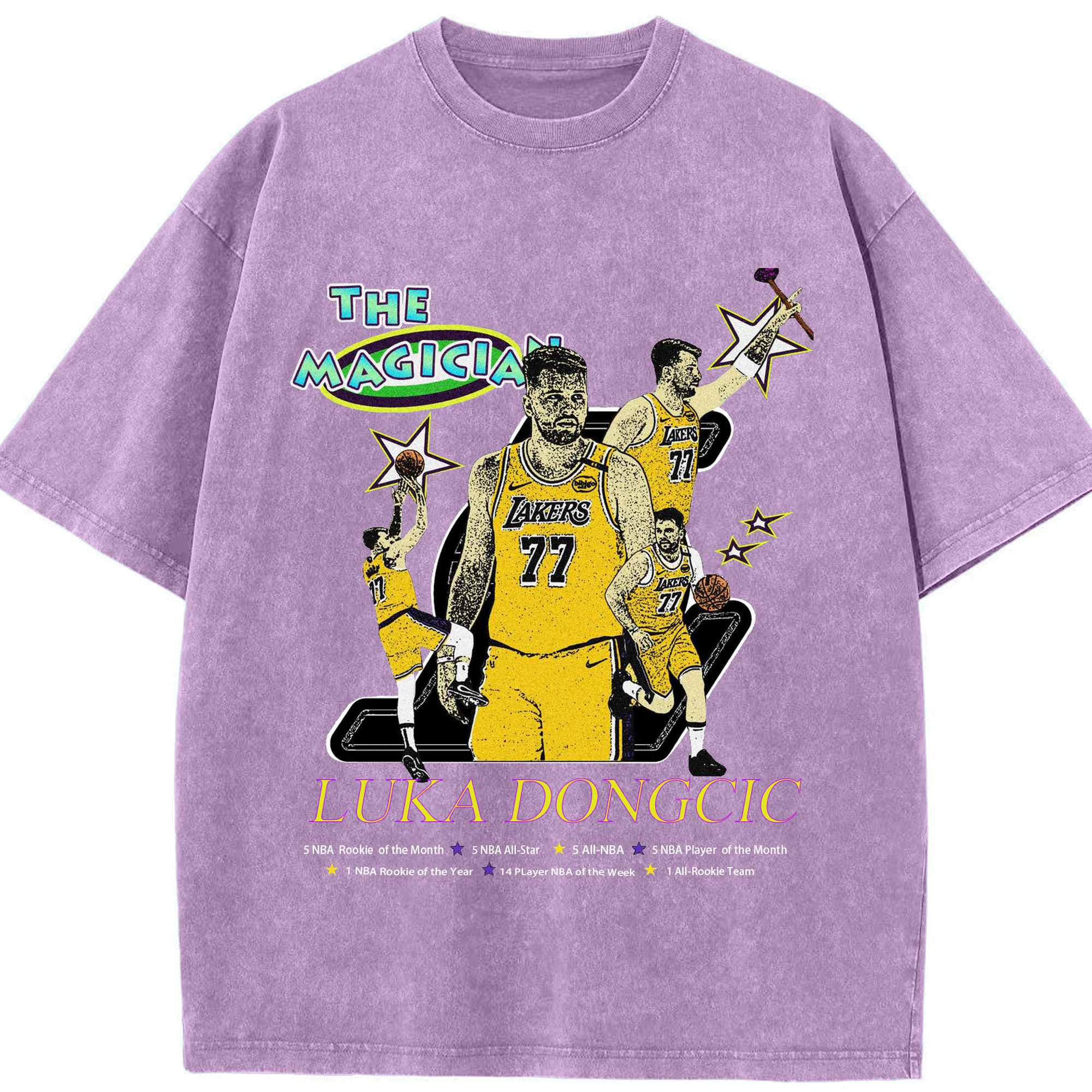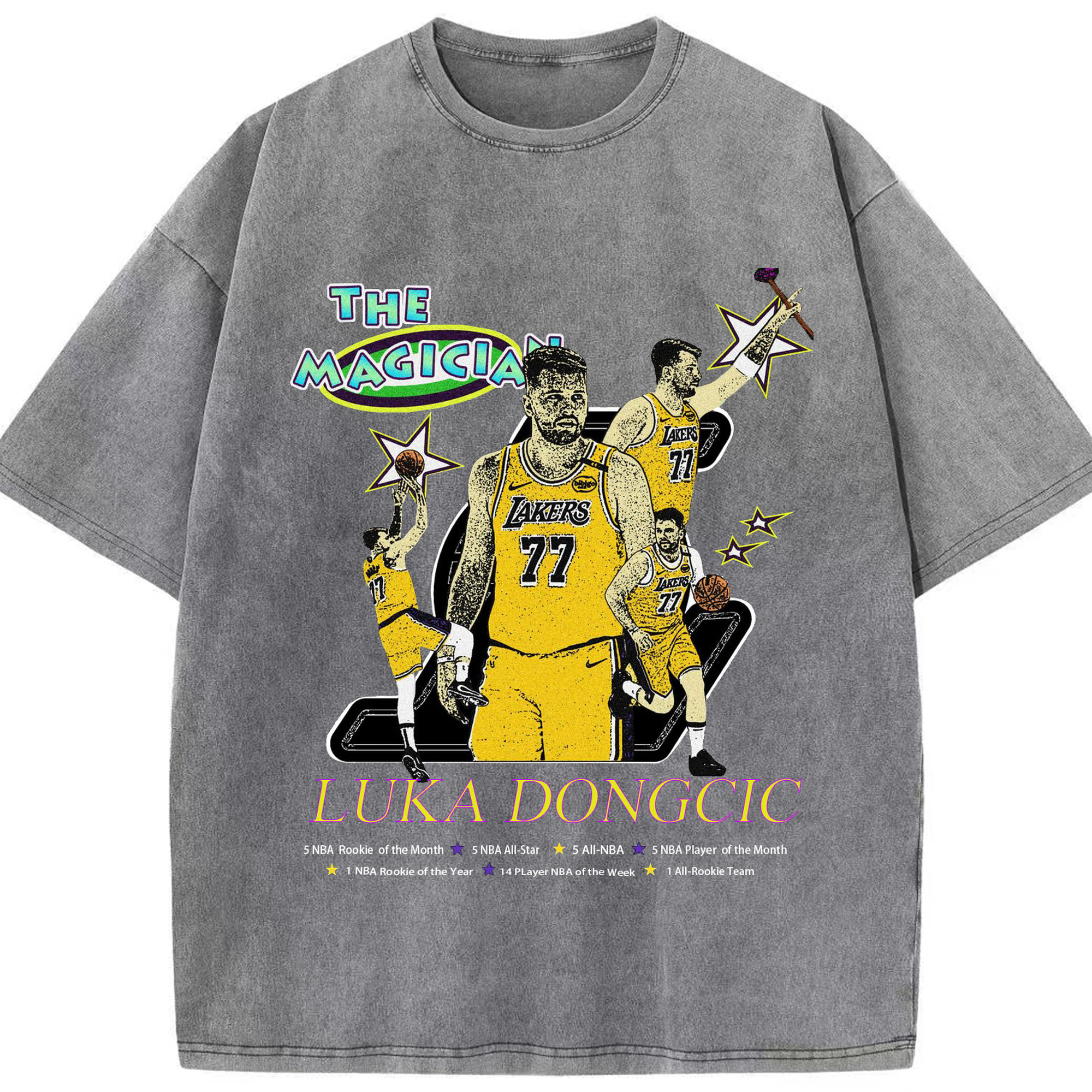 The Magician Luka Dončić Lakers 77 Jersey Shirt - Washed Vintage Look 230g Cotton Oversized T-Shirt With Front Heat Transfer Print – Soft, Lightweight, Stylish Fit – Comfortable Casual Wear For Sports & Everyday Use