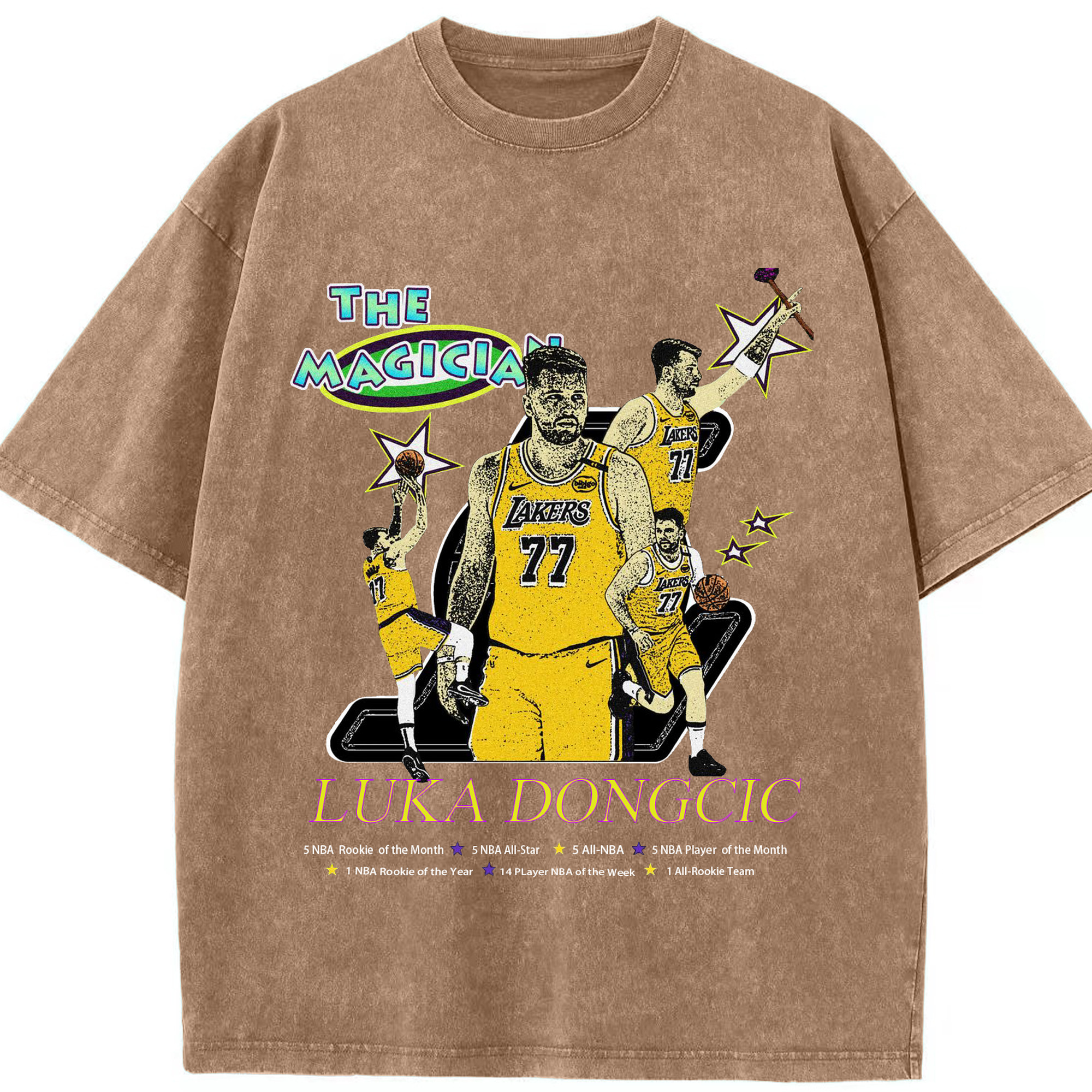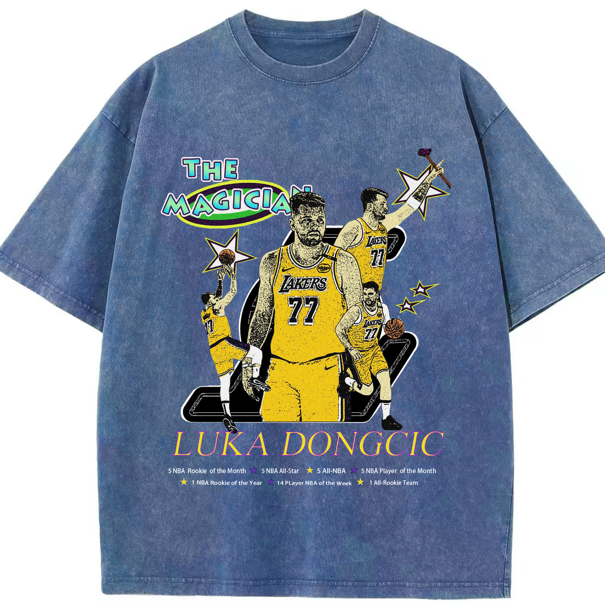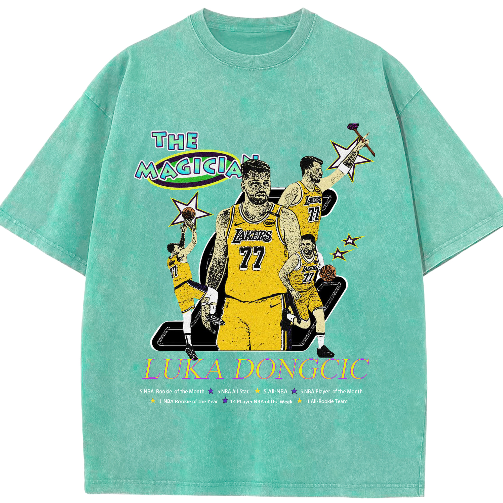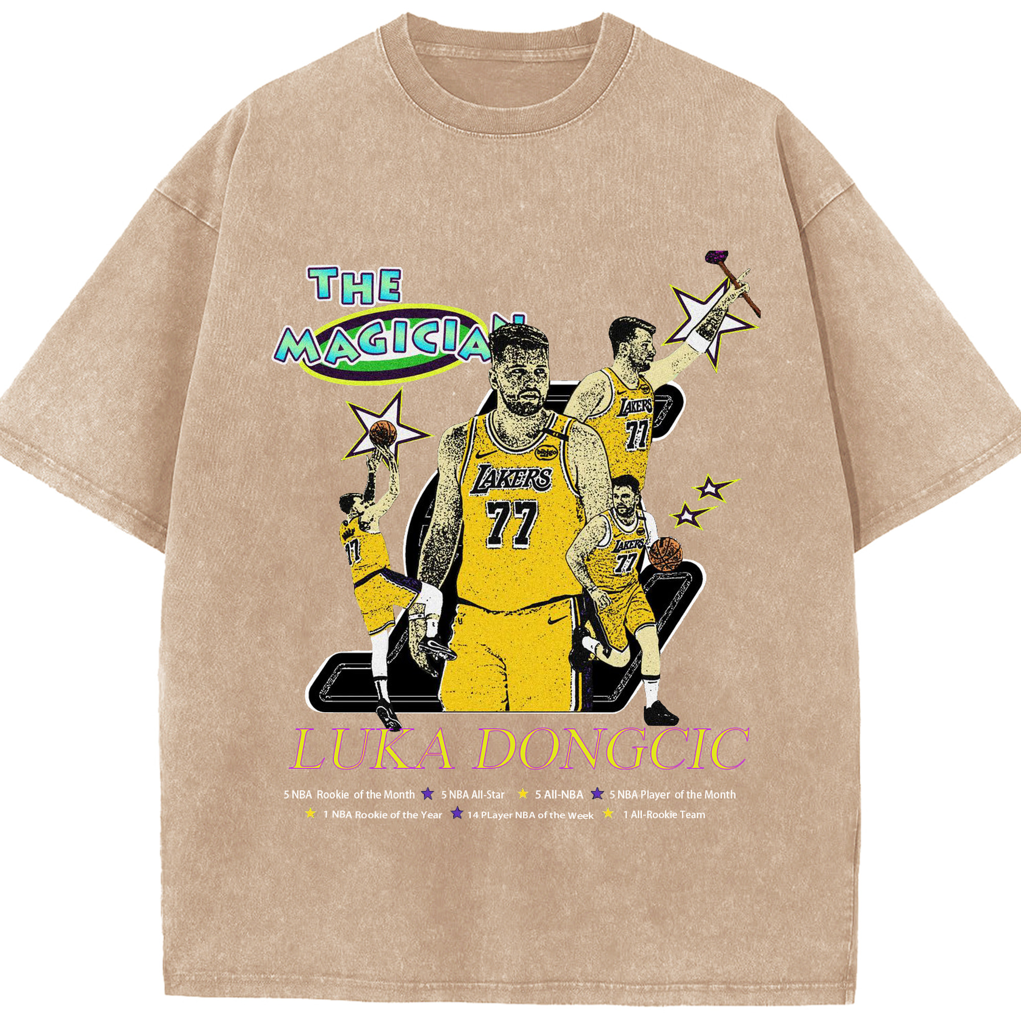 The Magician Luka Dončić Lakers 77 Jersey Shirt - Washed Vintage Look 230g Cotton Oversized T-Shirt With Front Heat Transfer Print – Soft, Lightweight, Stylish Fit – Comfortable Casual Wear For Sports & Everyday Use