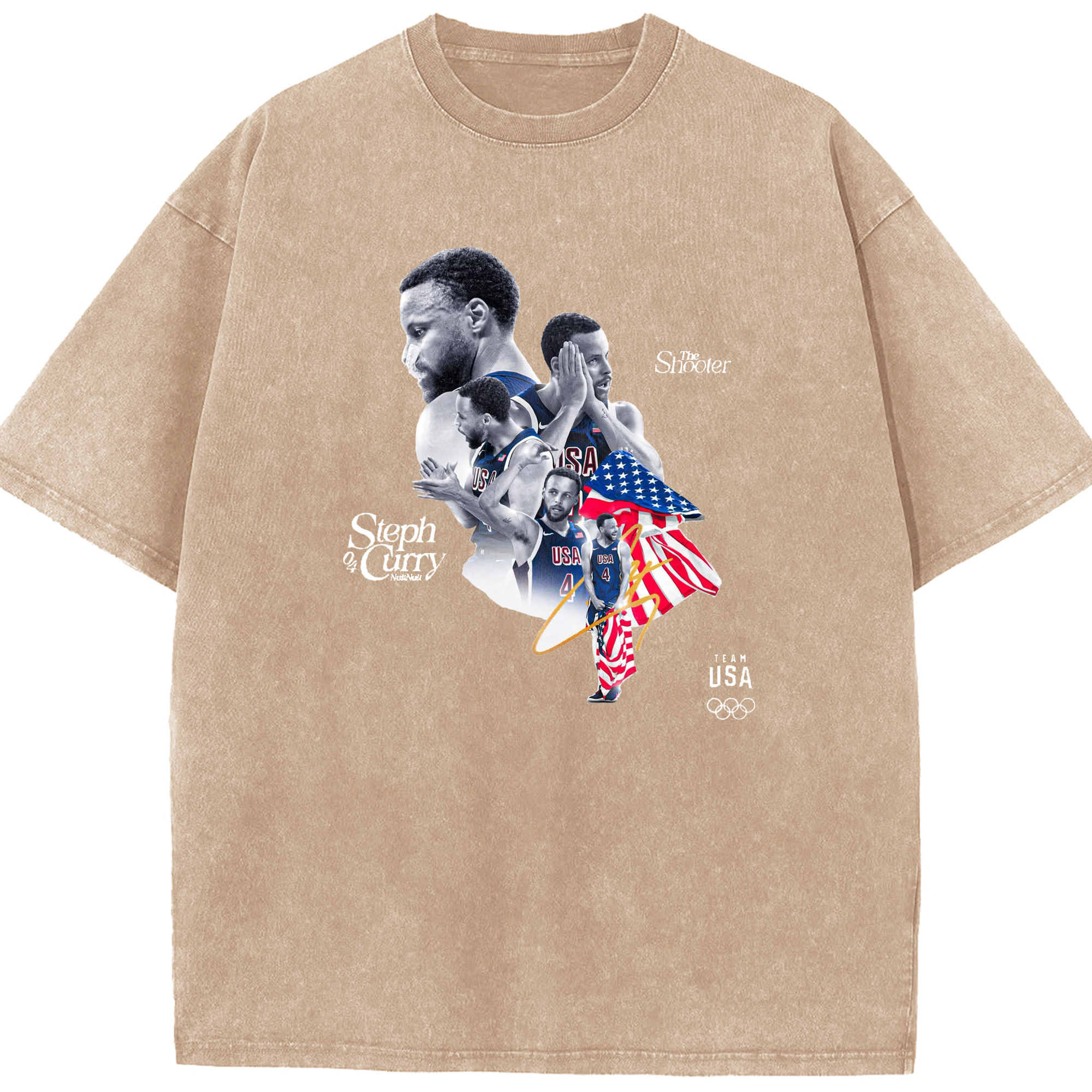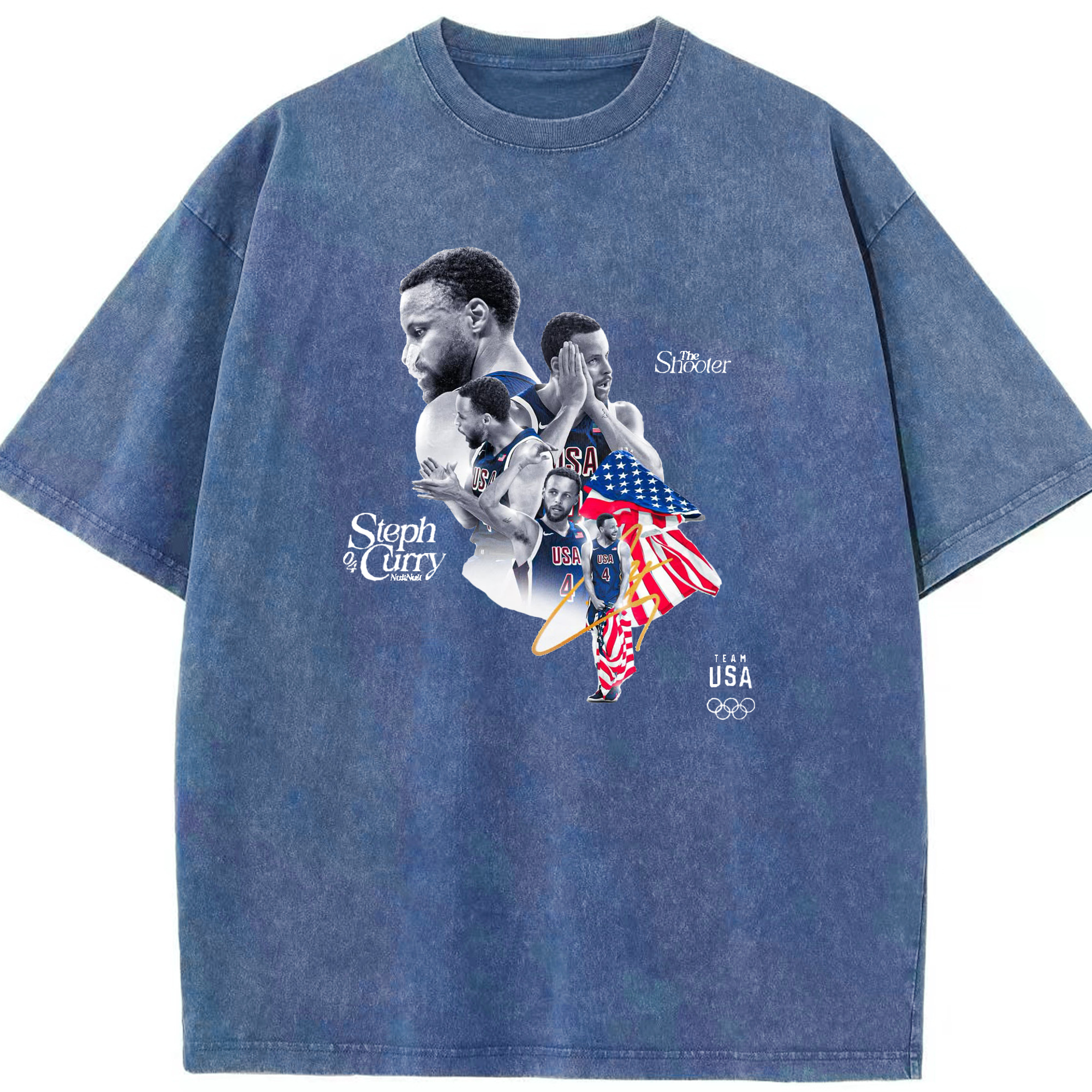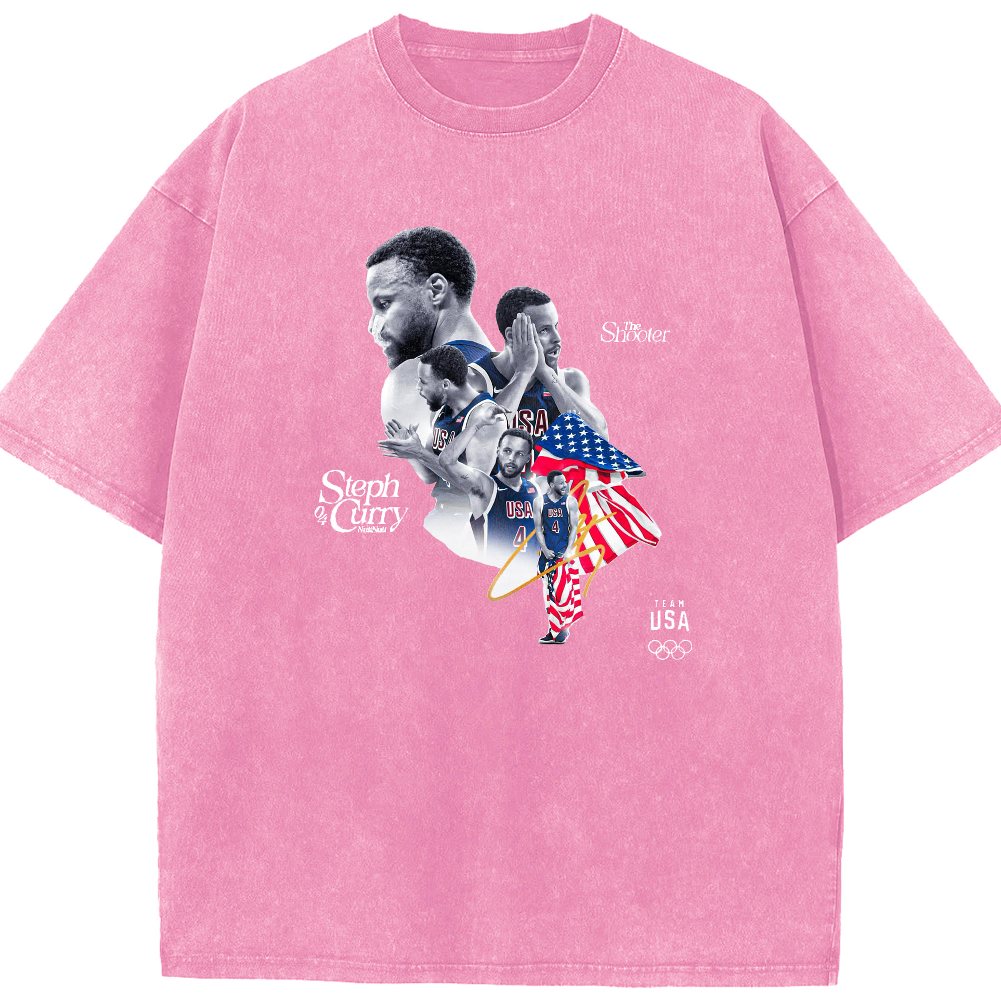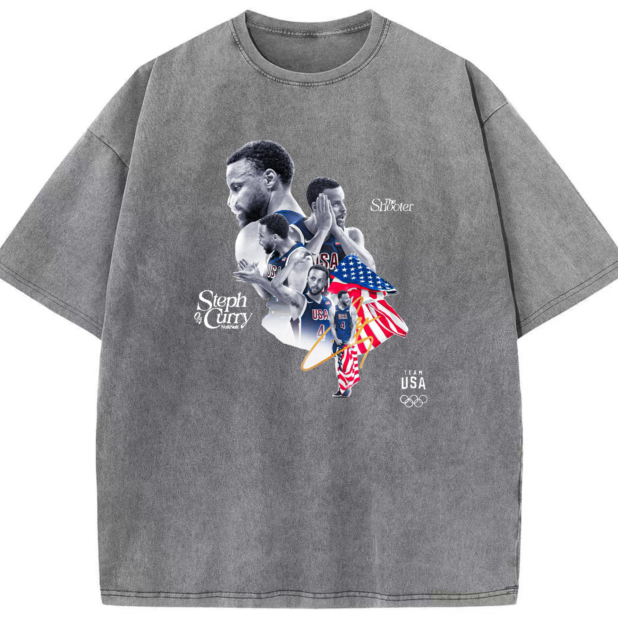 USA Basketball Curry #4 Shirt - Washed Vintage Look 230g Cotton Oversized T-Shirt With Front Heat Transfer Print – Soft, Lightweight, Stylish Fit – Comfortable Casual Wear For Sports & Everyday Use