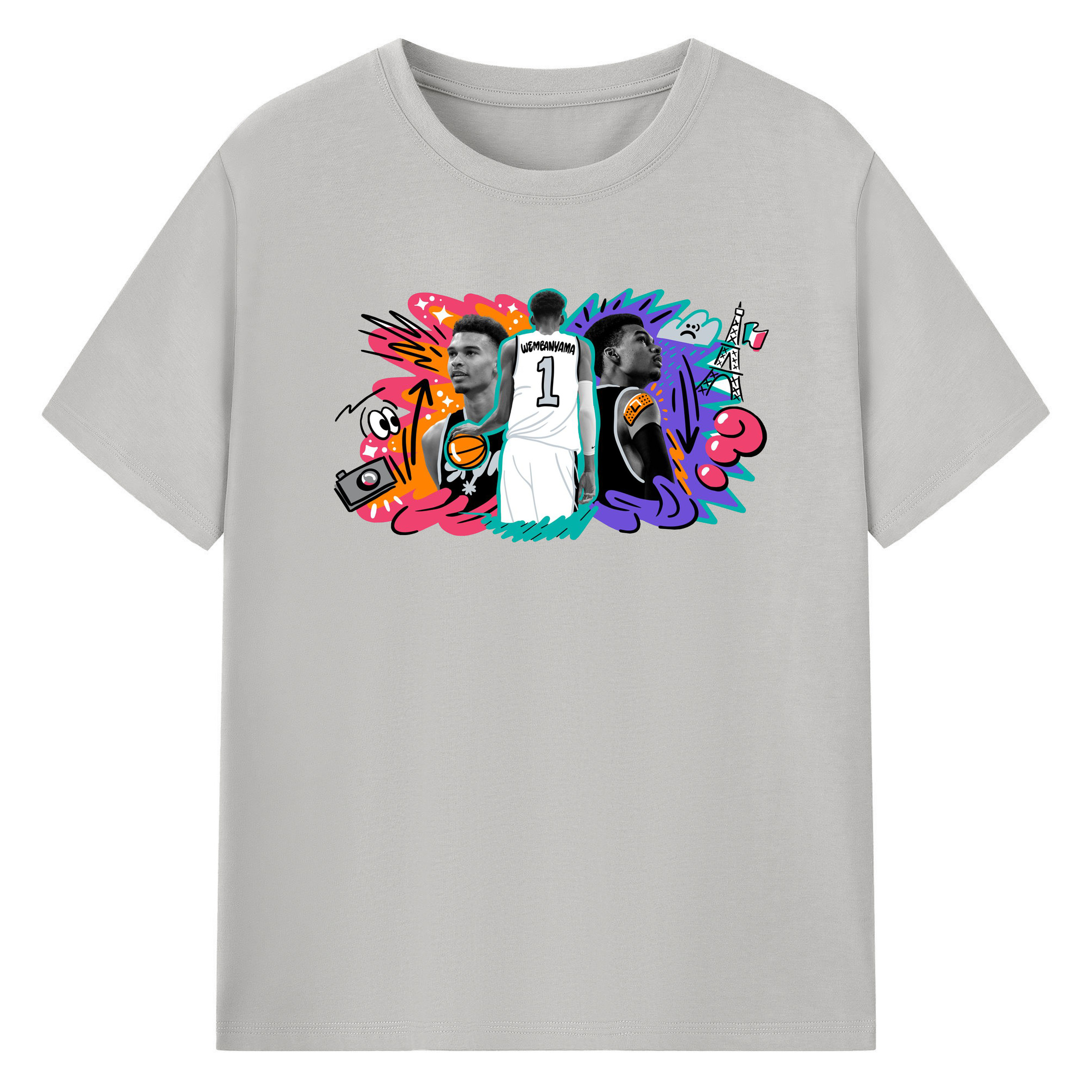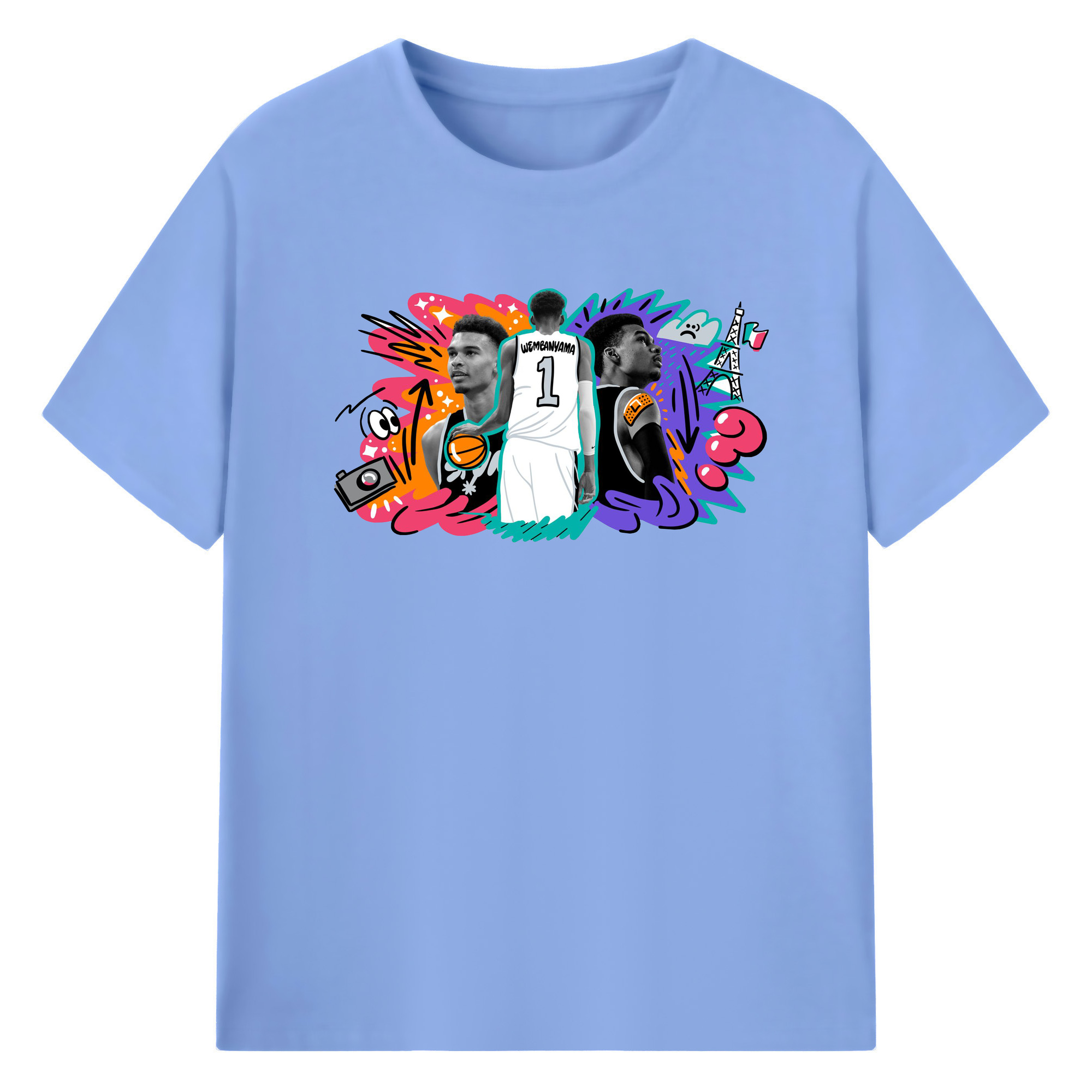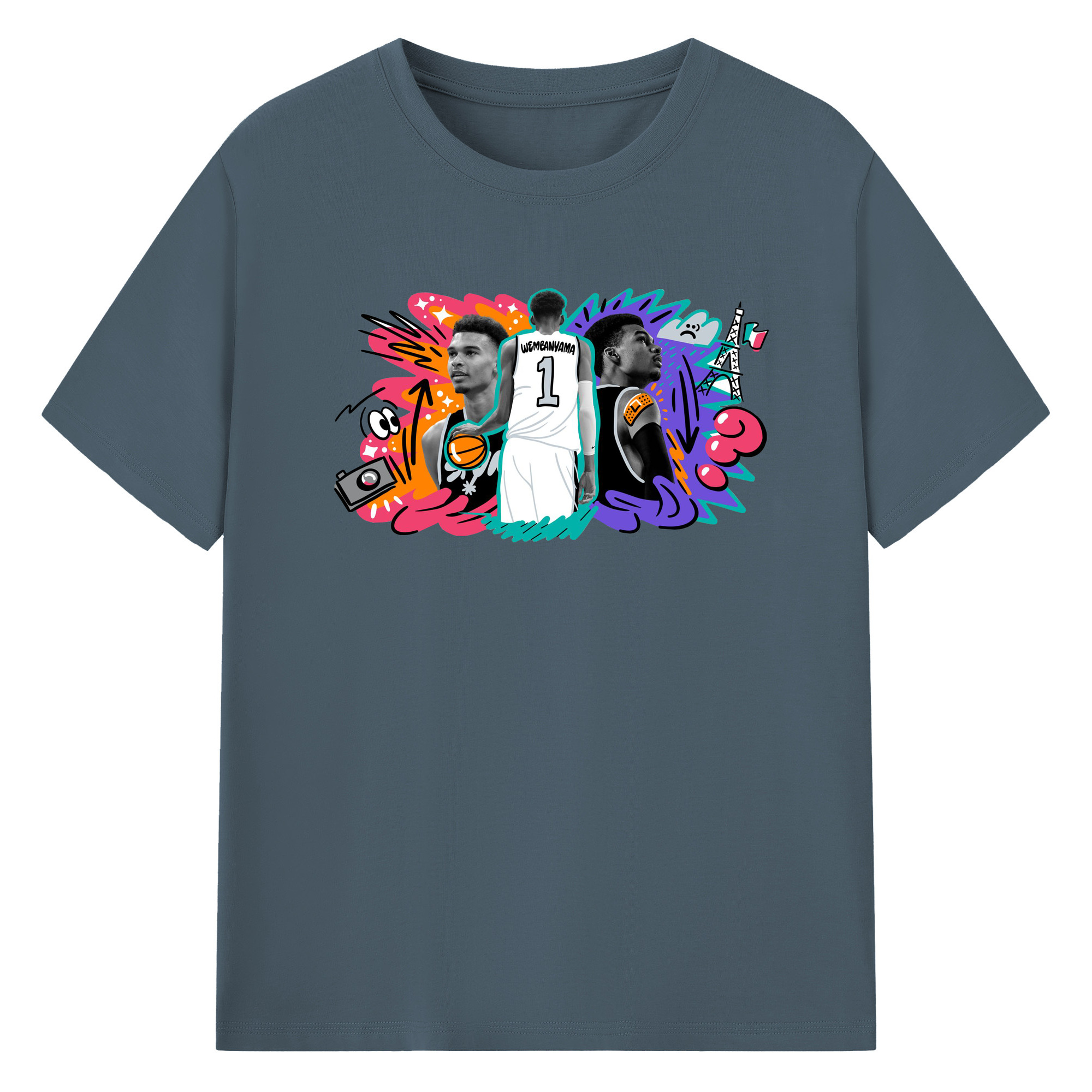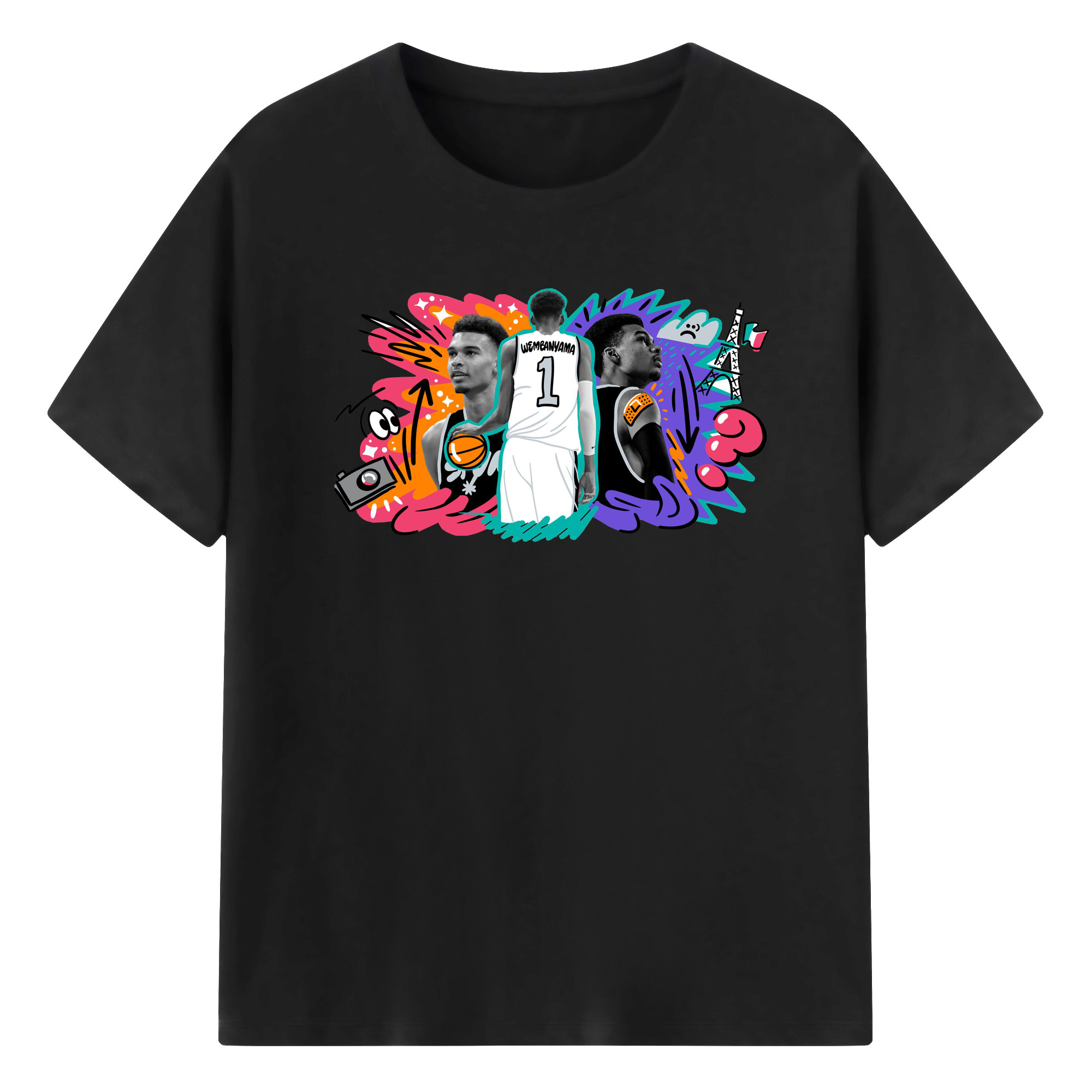 Victor Wembanyama #1 Cartoon graffiti style Shirt - 180g Cotton T-Shirt With Front Heat Transfer Print – Soft, Lightweight, Fitted Design – Comfortable Casual Wear For Sports & Everyday Use